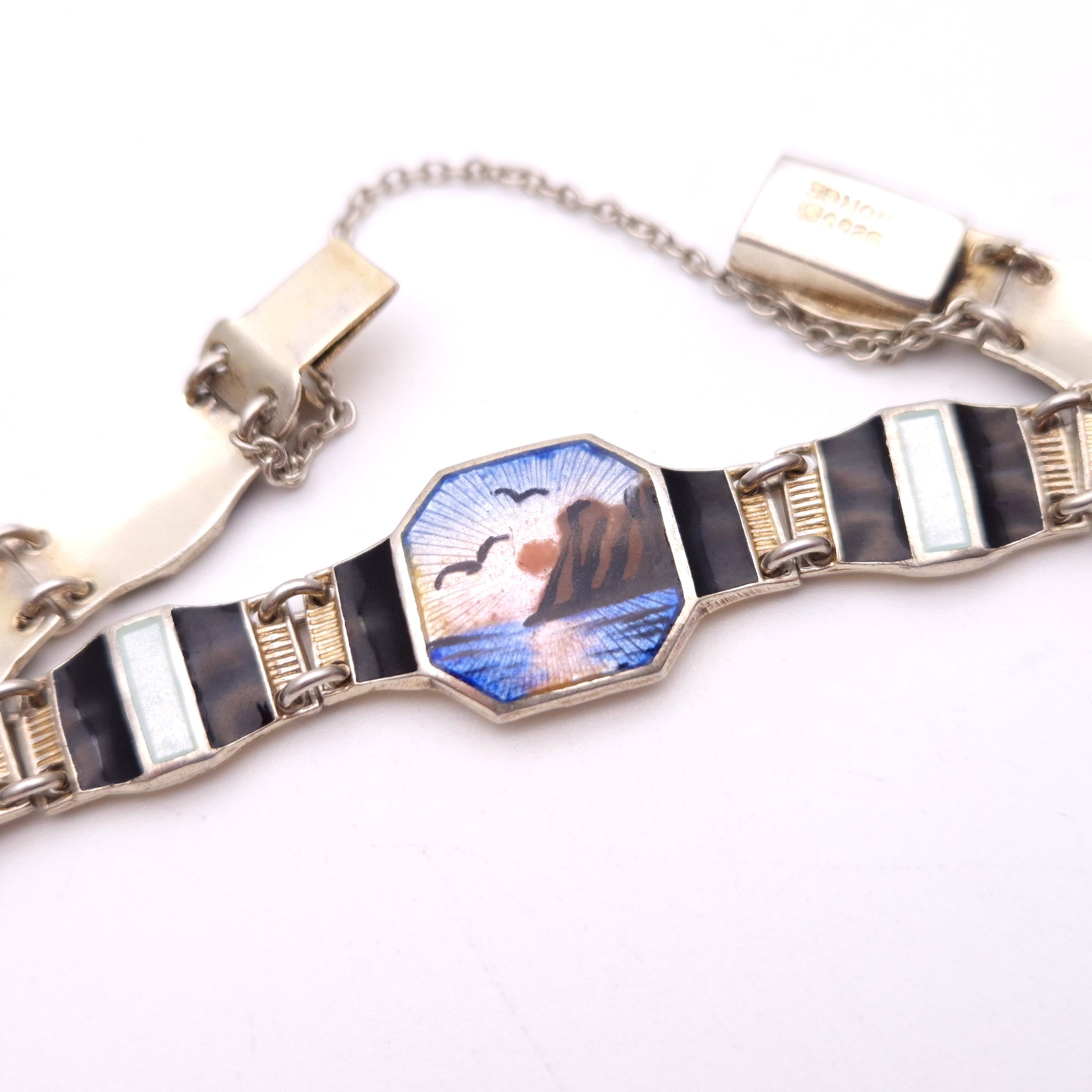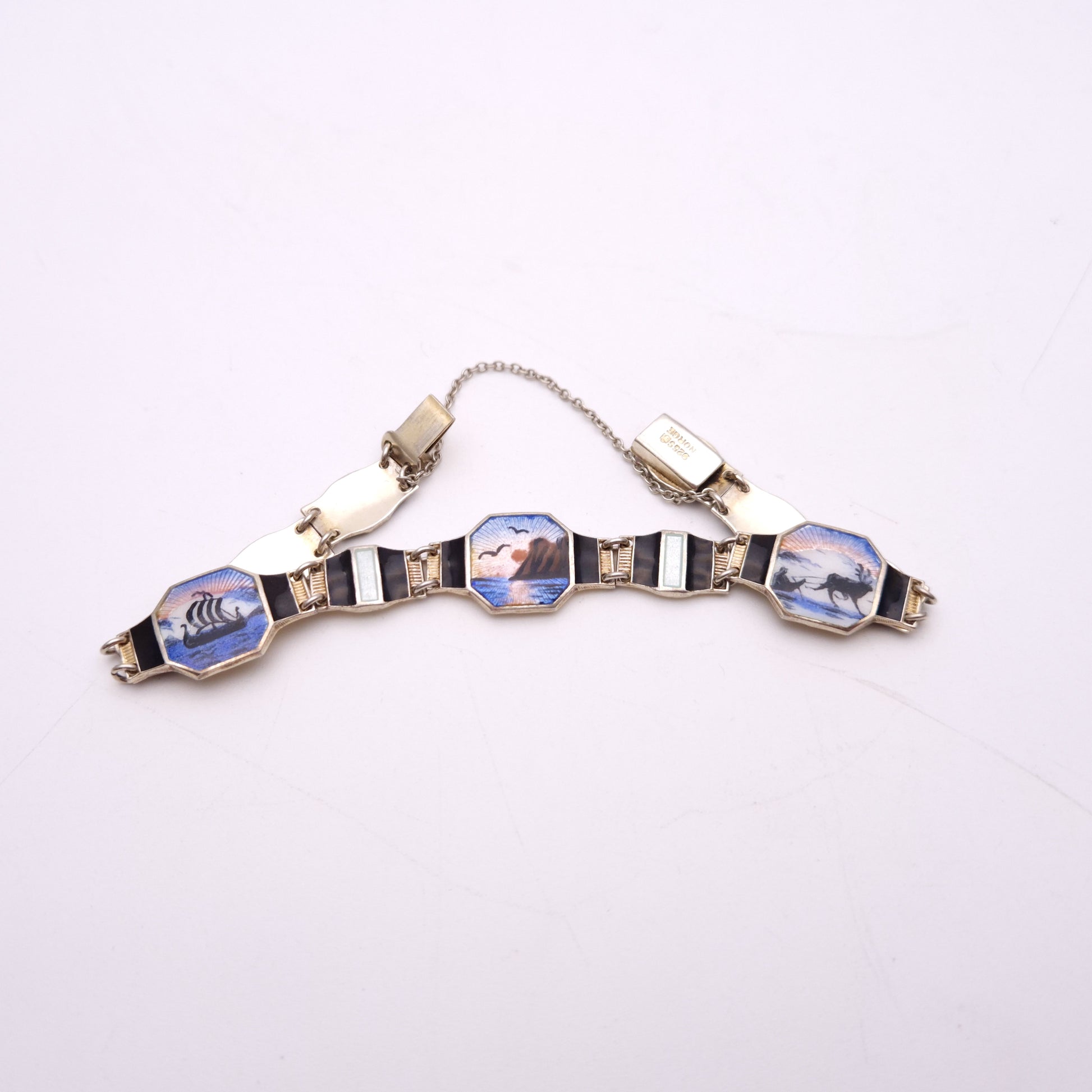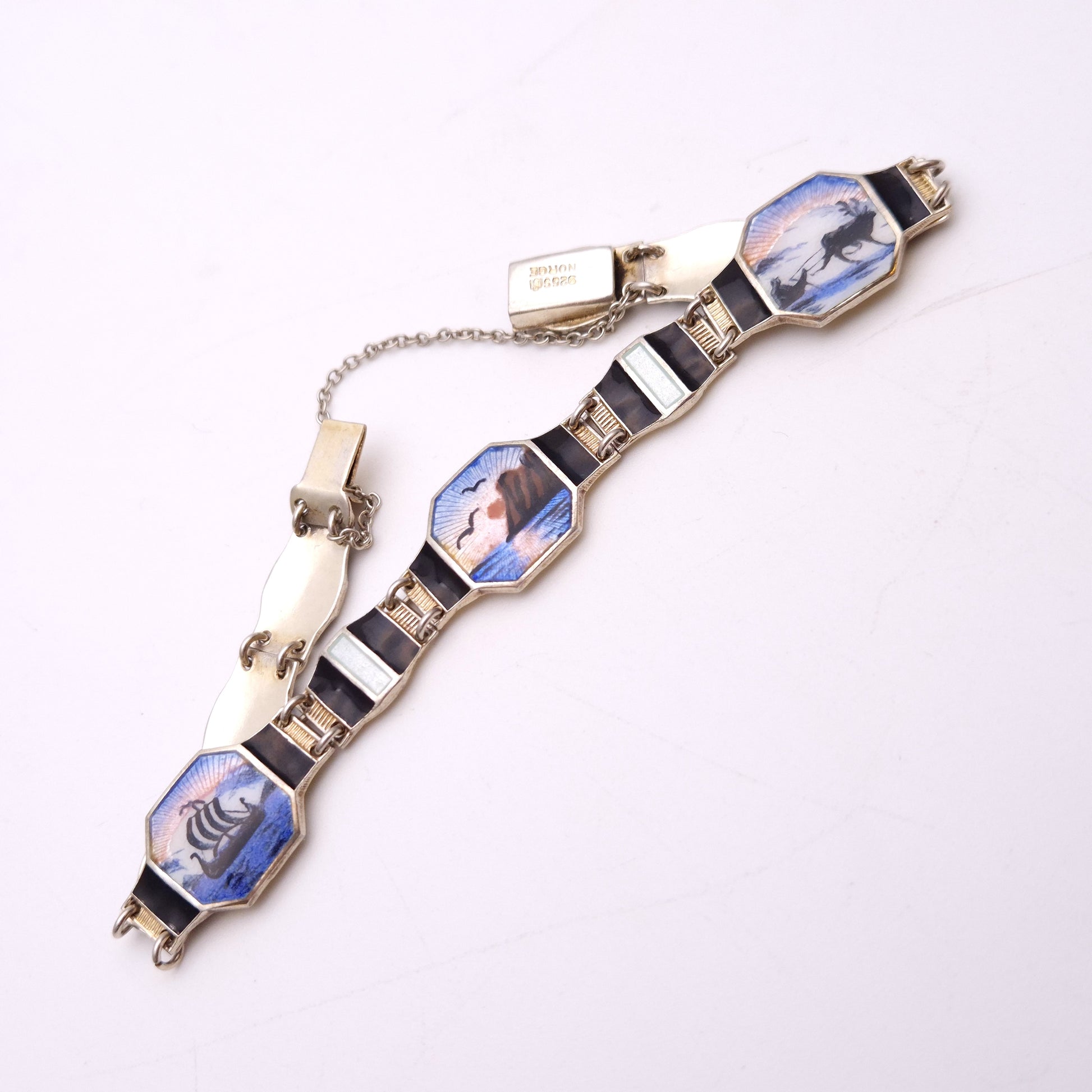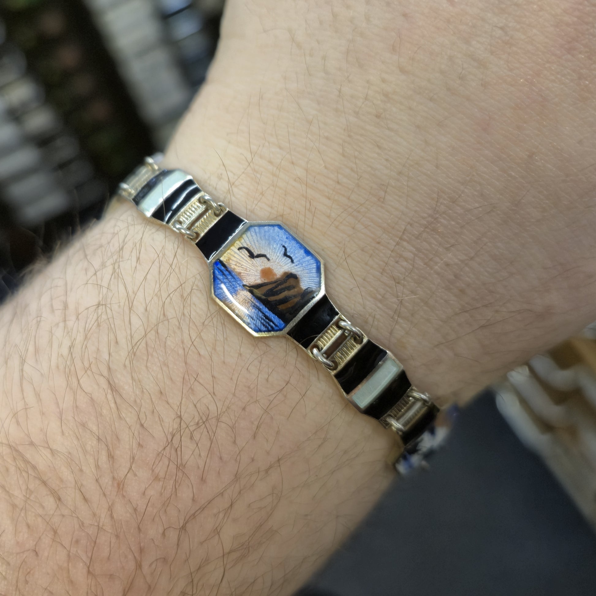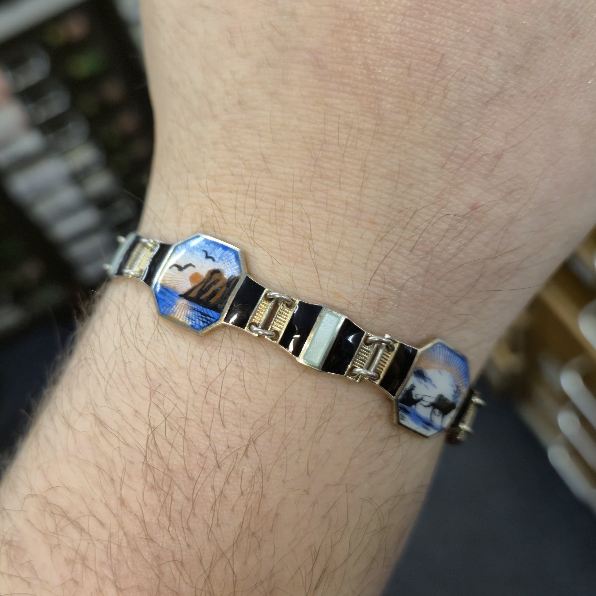 The enamel colours in these scenes are vibrant and nuanced, showcasing the artistry for which Norwegian enamel is renowned. Between these pictorial panels are alternating smaller links: with elegant black and white enamel, providing a sophisticated geometric contrast that highlights the pictorial links. The bracelet is secured with a classic box clasp, often found in vintage jewellery, and for added security, it includes a safety chain.