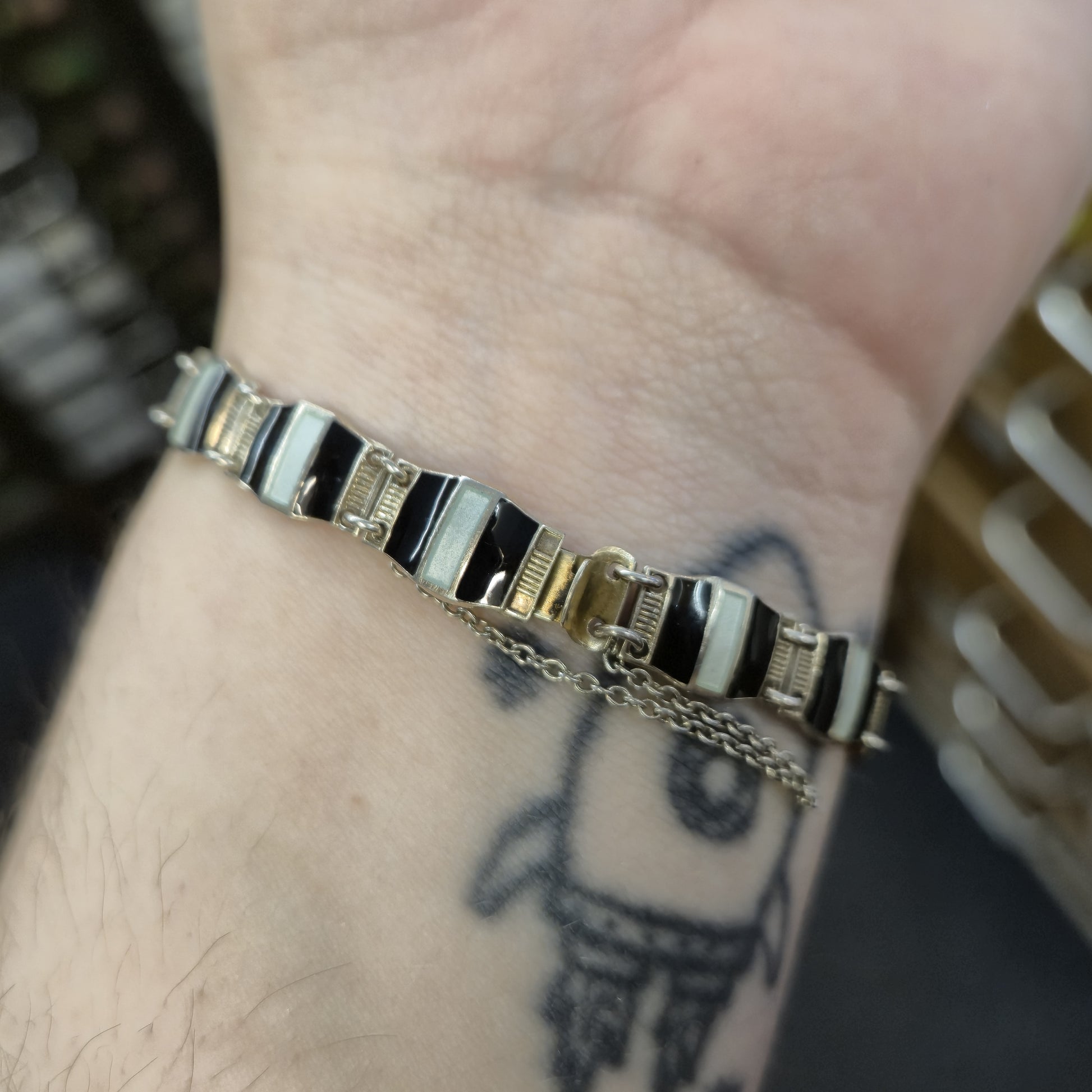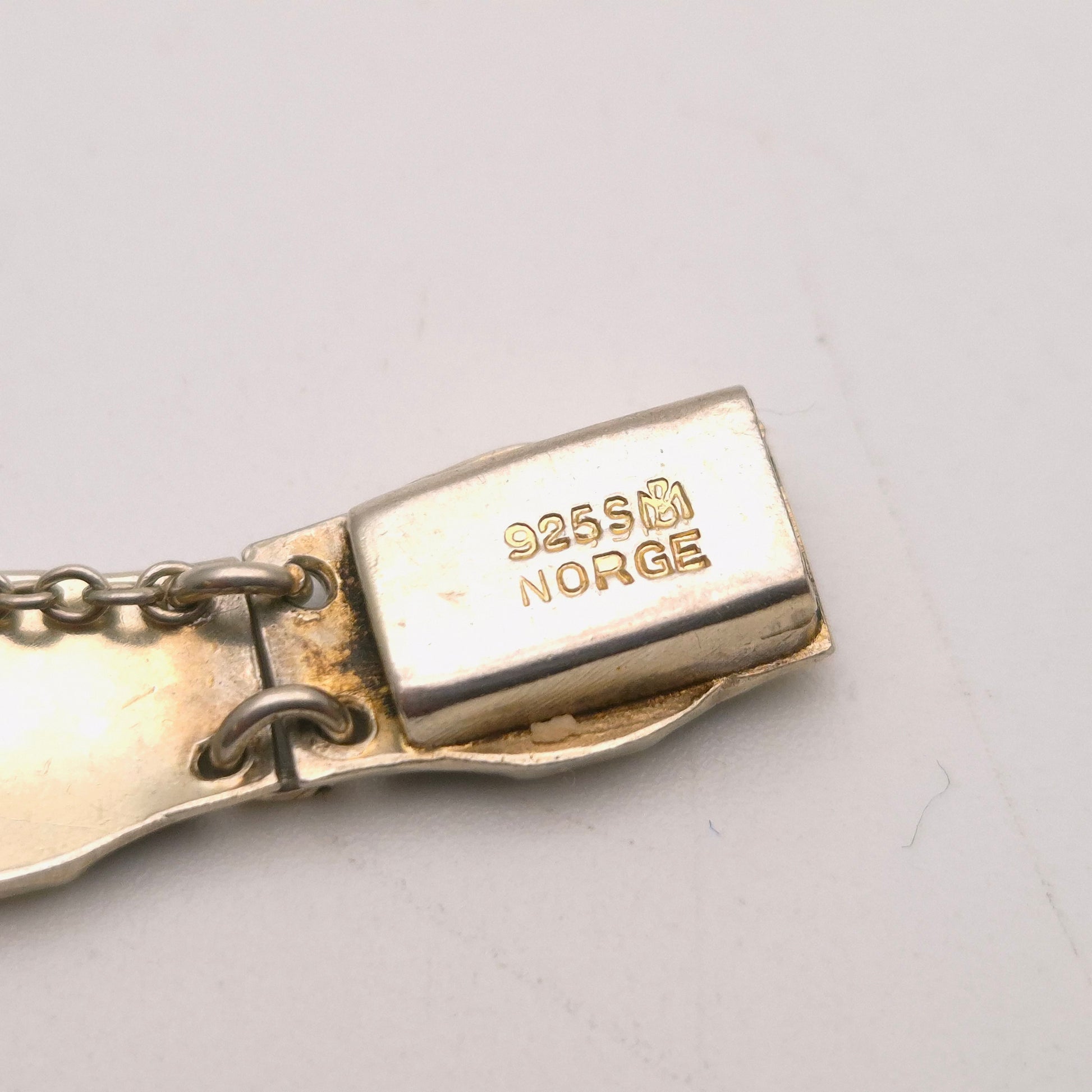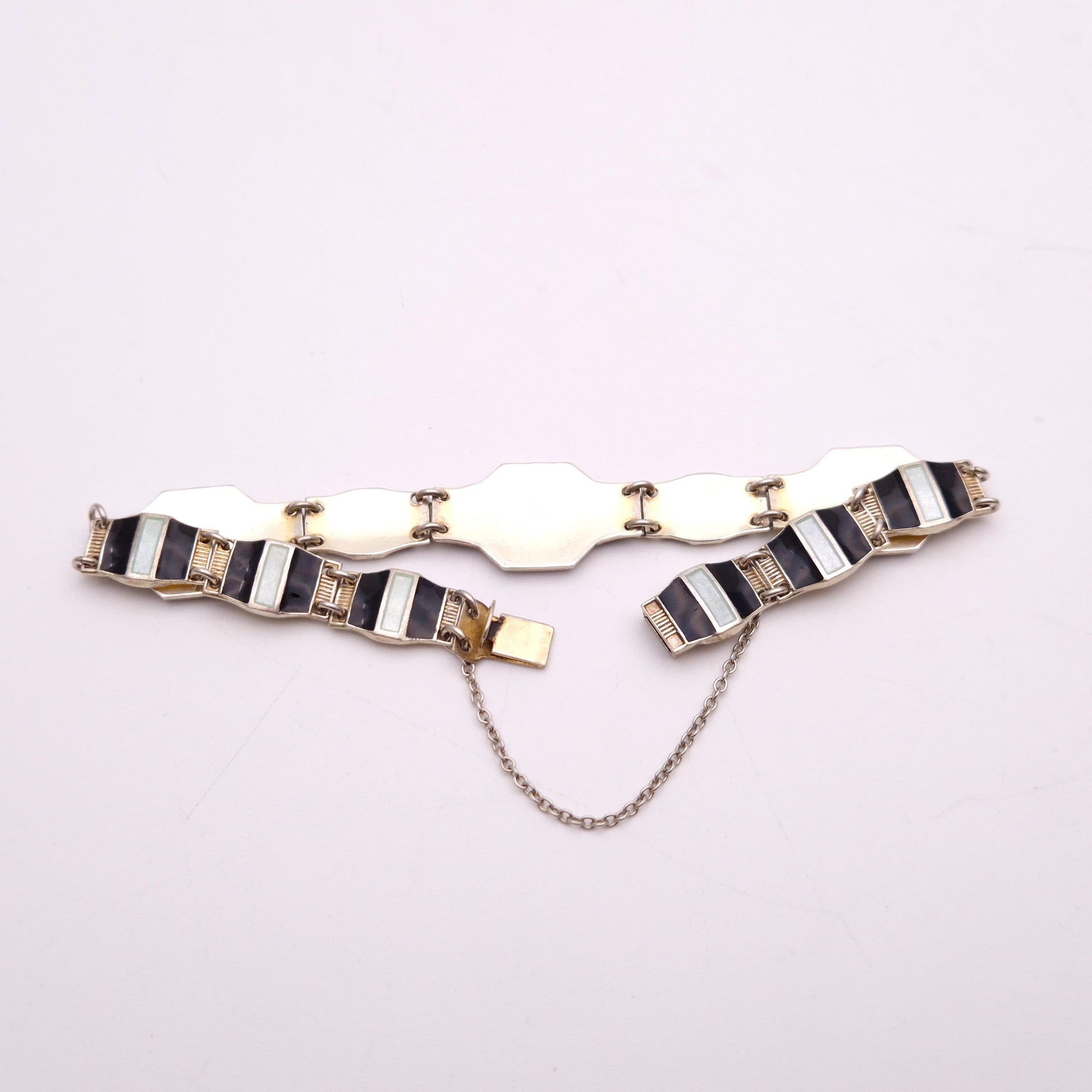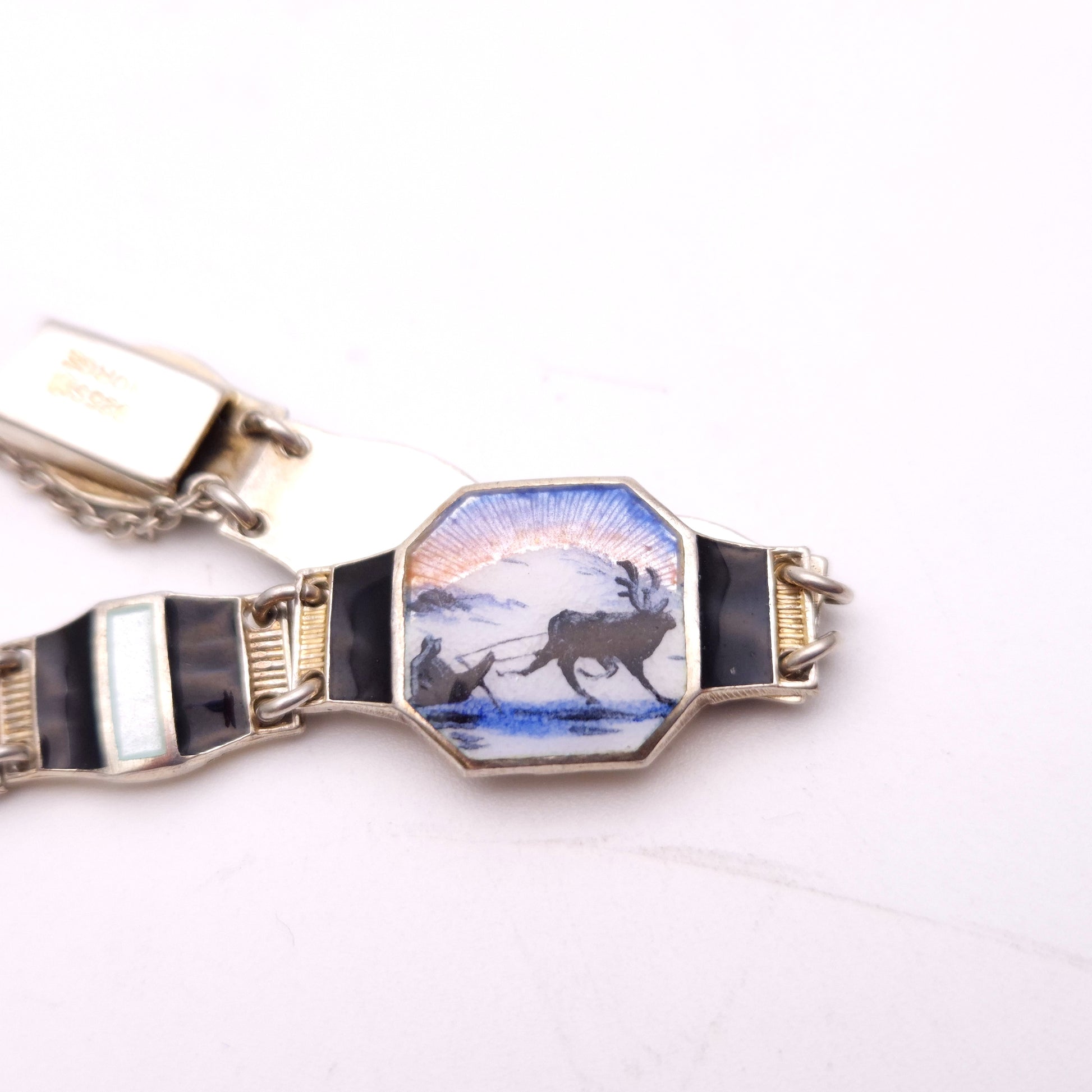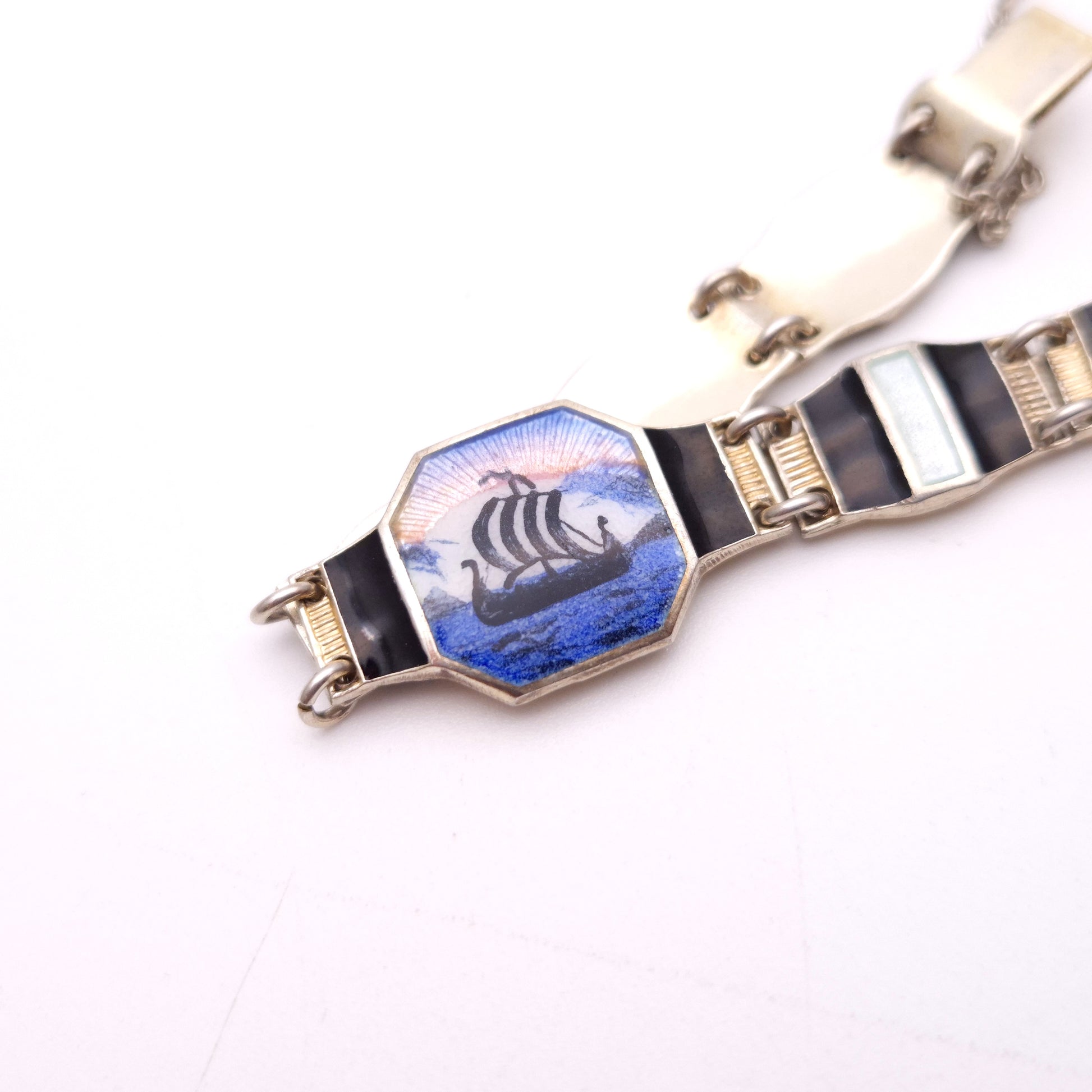 The enamel colours in these scenes are vibrant and nuanced, showcasing the artistry for which Norwegian enamel is renowned. Between these pictorial panels are alternating smaller links: with elegant black and white enamel, providing a sophisticated geometric contrast that highlights the pictorial links. The bracelet is secured with a classic box clasp, often found in vintage jewellery, and for added security, it includes a safety chain.