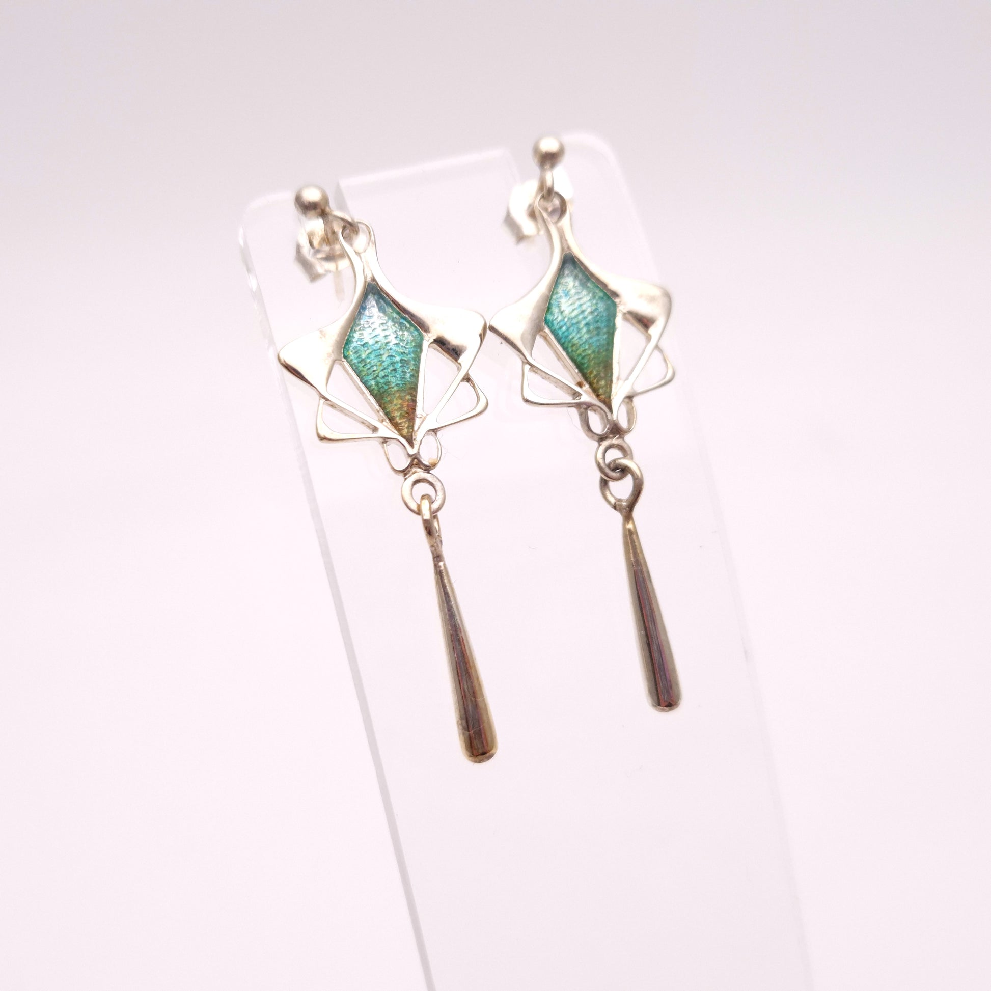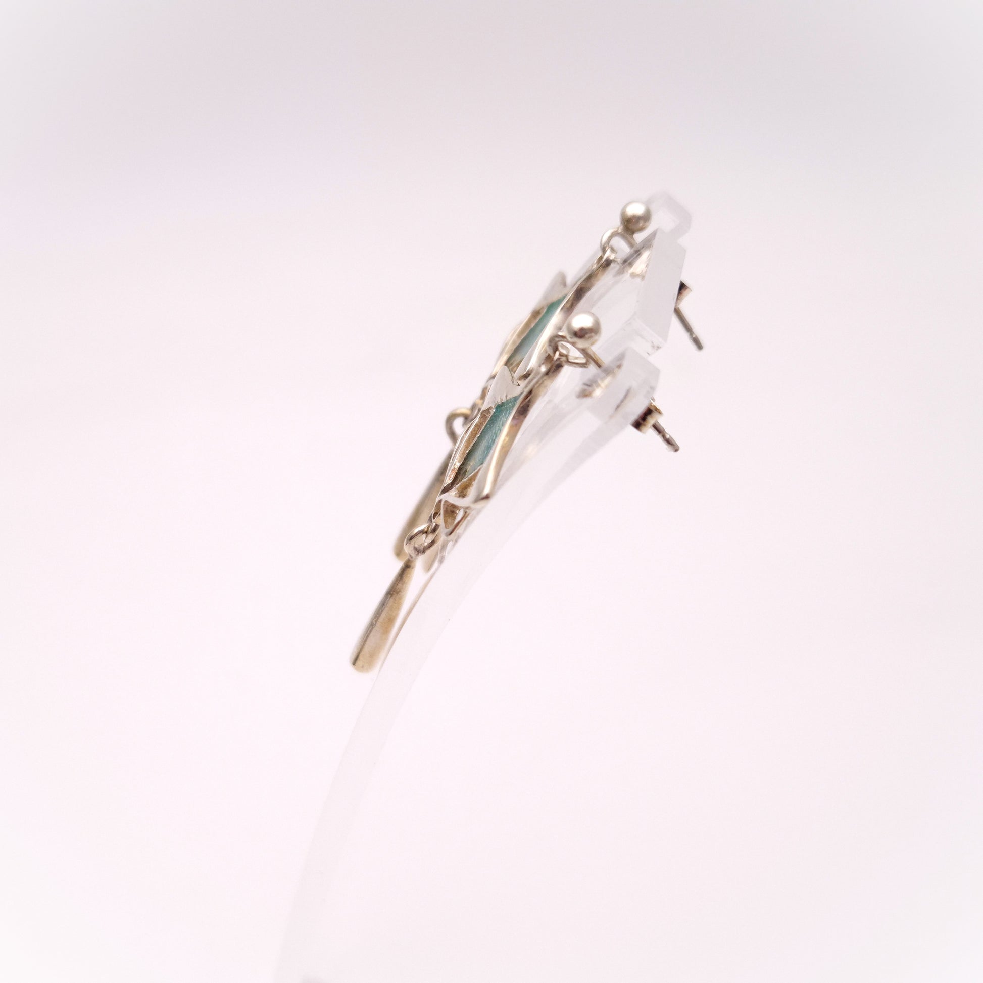 These beautiful drop earrings are a classic and highly collectible example of the work of renowned Scottish jeweler, Pat Cheney. They are crafted from sterling silver and feature a striking geometric design that embodies the elegant and stylized aesthetic of the Art Deco period.