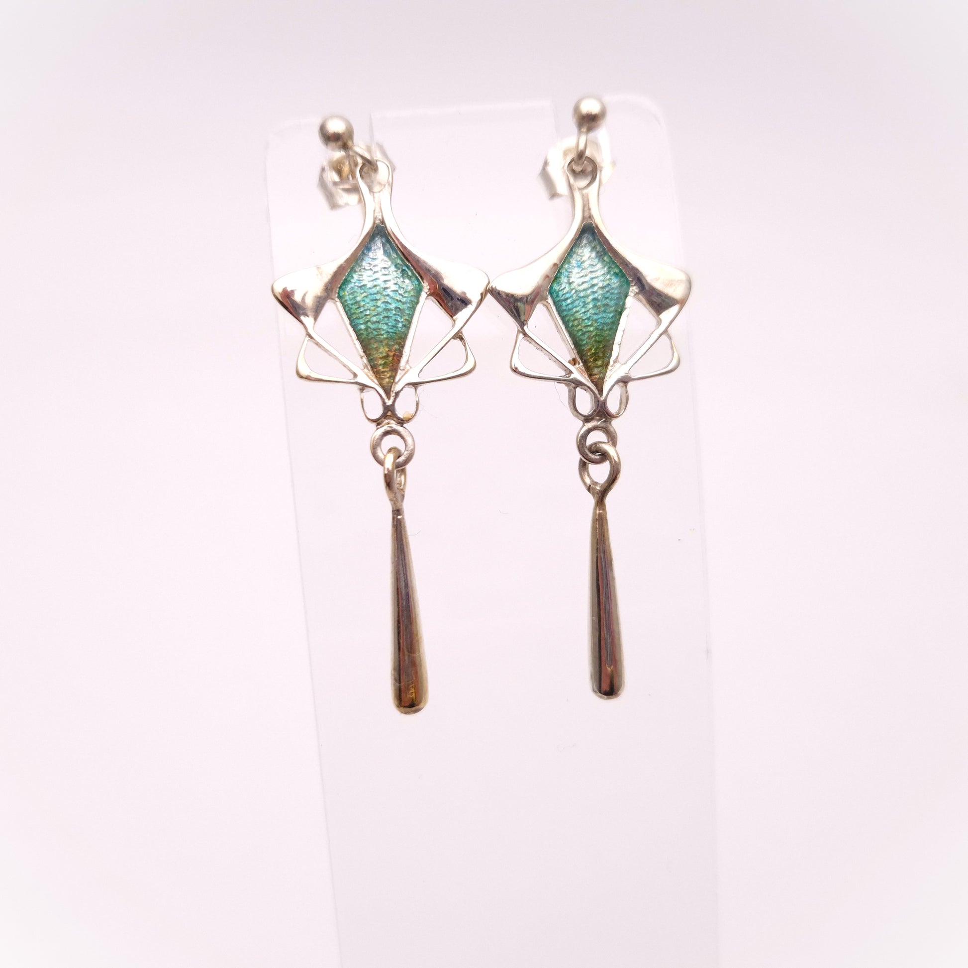 The top stud and the main body of the earring are connected by a polished silver link, allowing them to dangle gracefully. The main body features a sophisticated kite-shaped frame, which is filled with vibrant enamel work. The enamel displays a stunning gradient of colours, flowing from a rich, amber to a deep teal to a lighter aqua green. The fine lines of the silver "cloisons" create a delicate pattern, adding to the intricate beauty of the piece. A slender, elongated silver drop hangs from the bottom, completing the sleek and modern Art Deco-inspired silhouette.