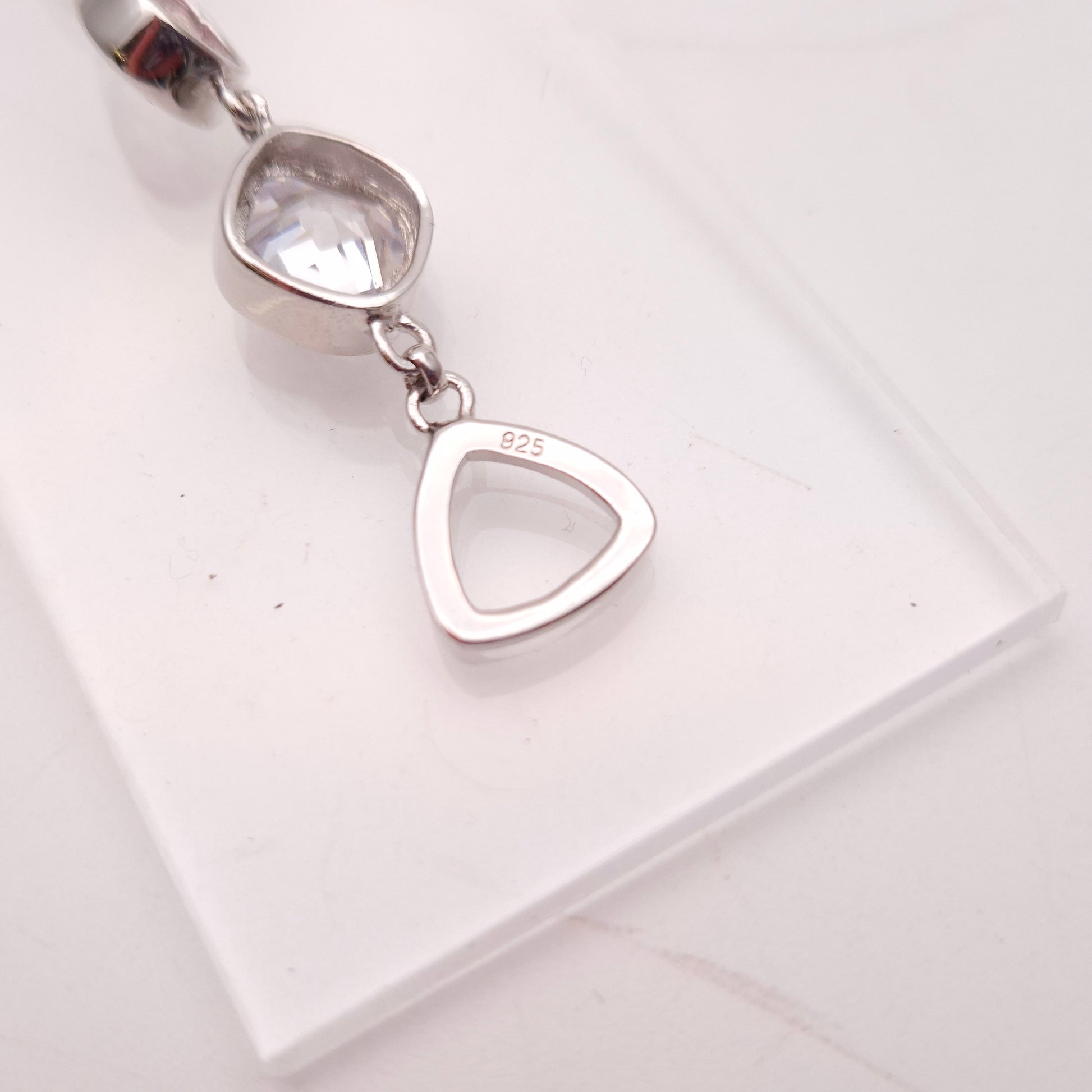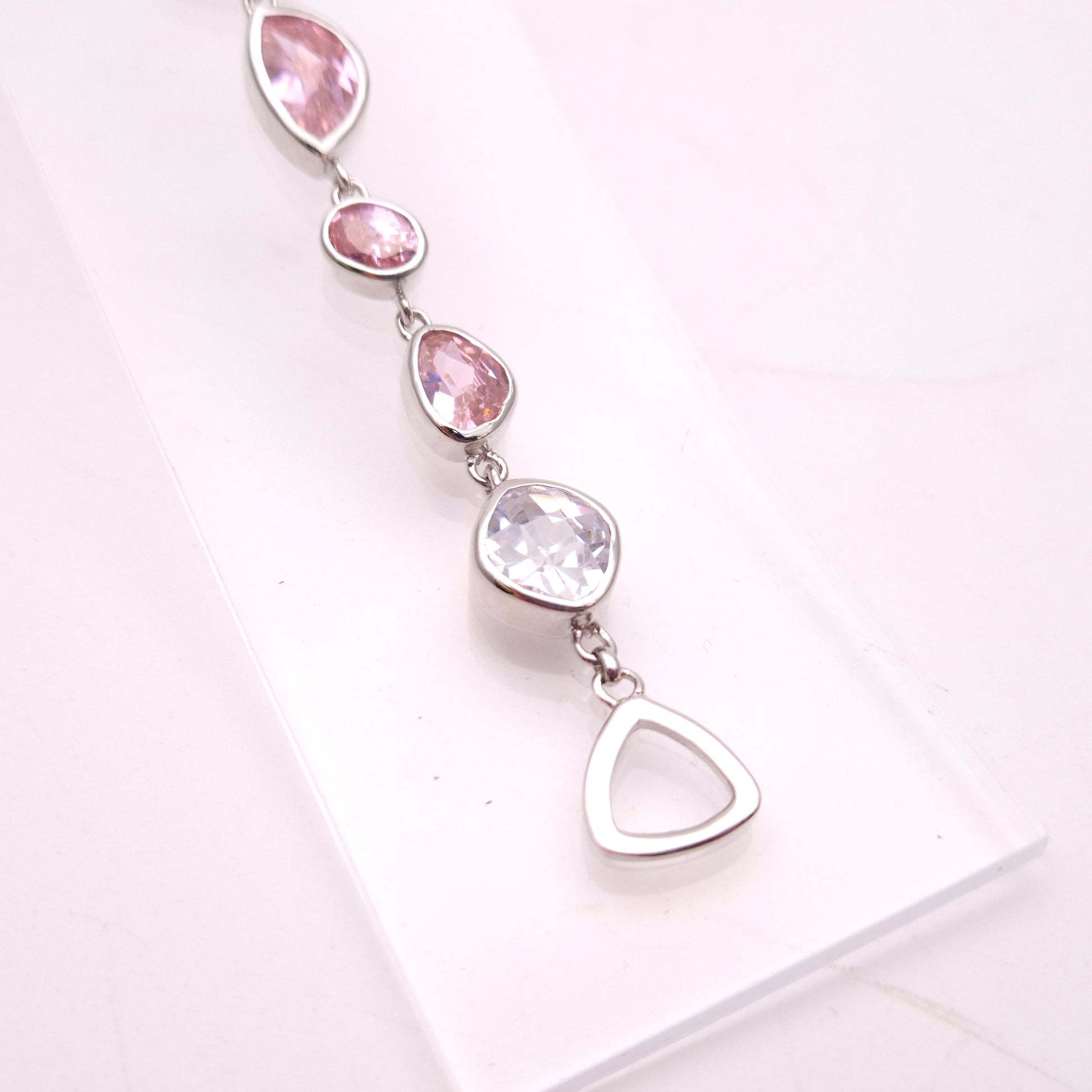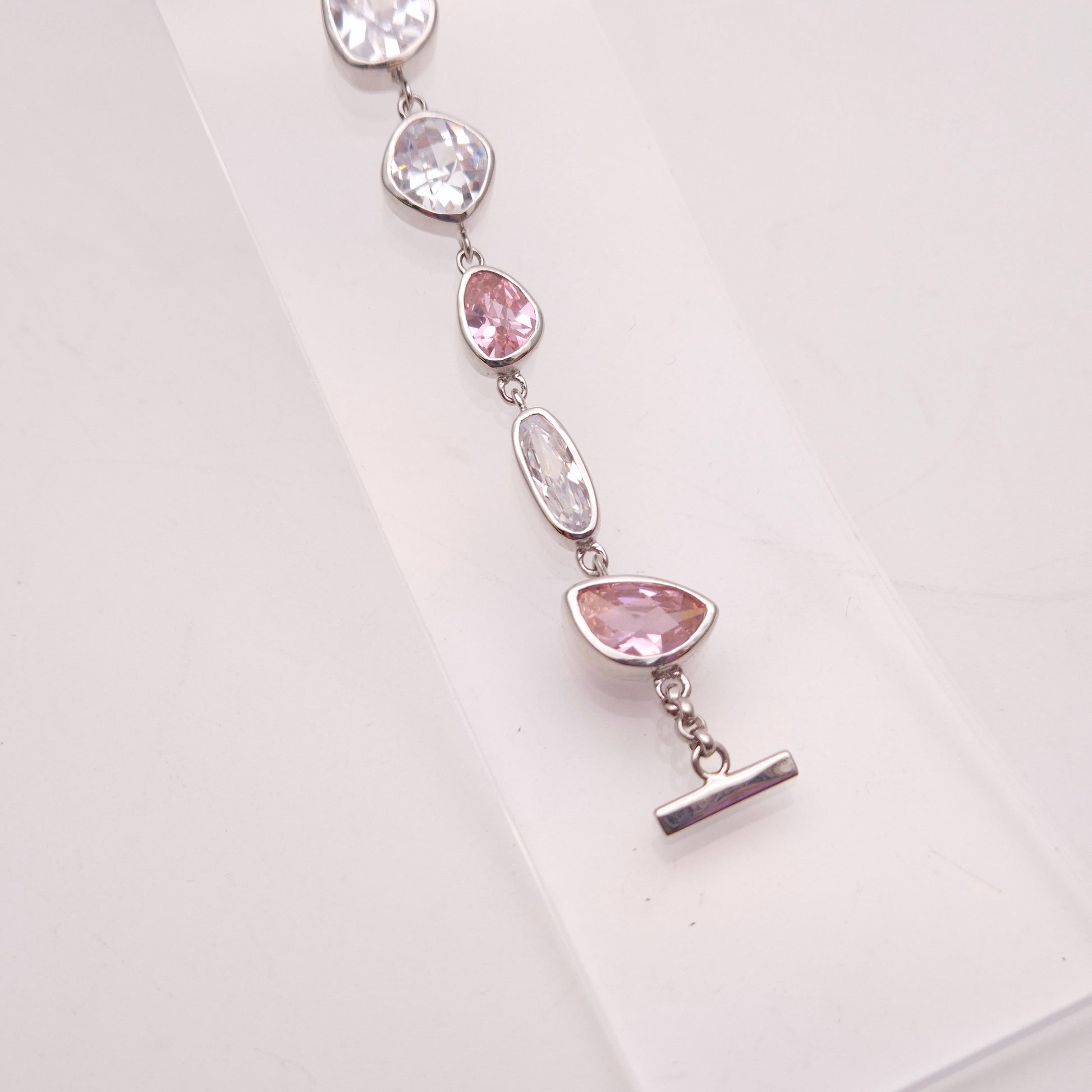 This charming bracelet features an alternating array of pink and clear/white cubic zirconia stones, each with a unique naturalist, organic shape. The varying sizes and irregular cuts of the stones give the piece a modern, handcrafted feel, while the polished sterling silver setting provides a clean, elegant foundation.