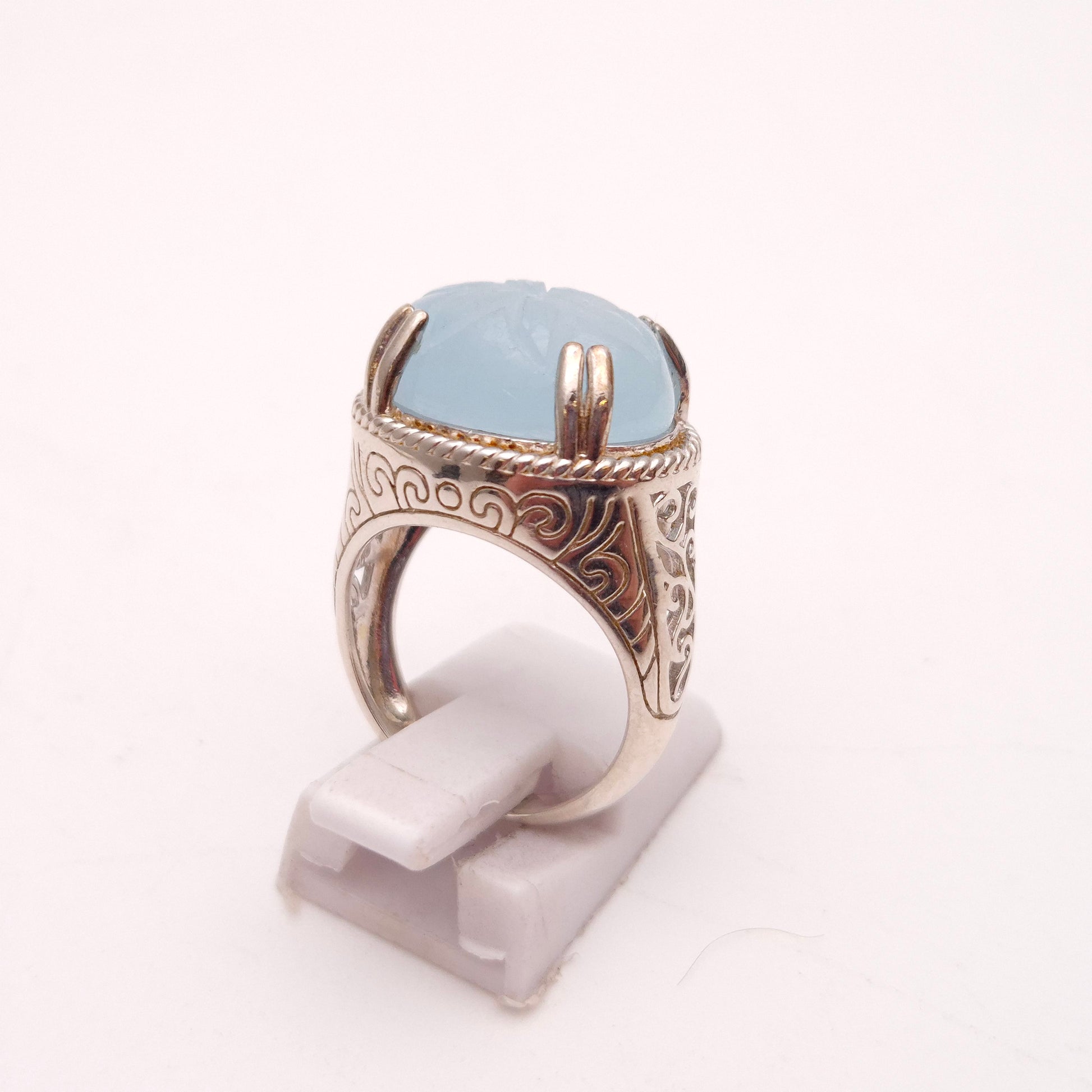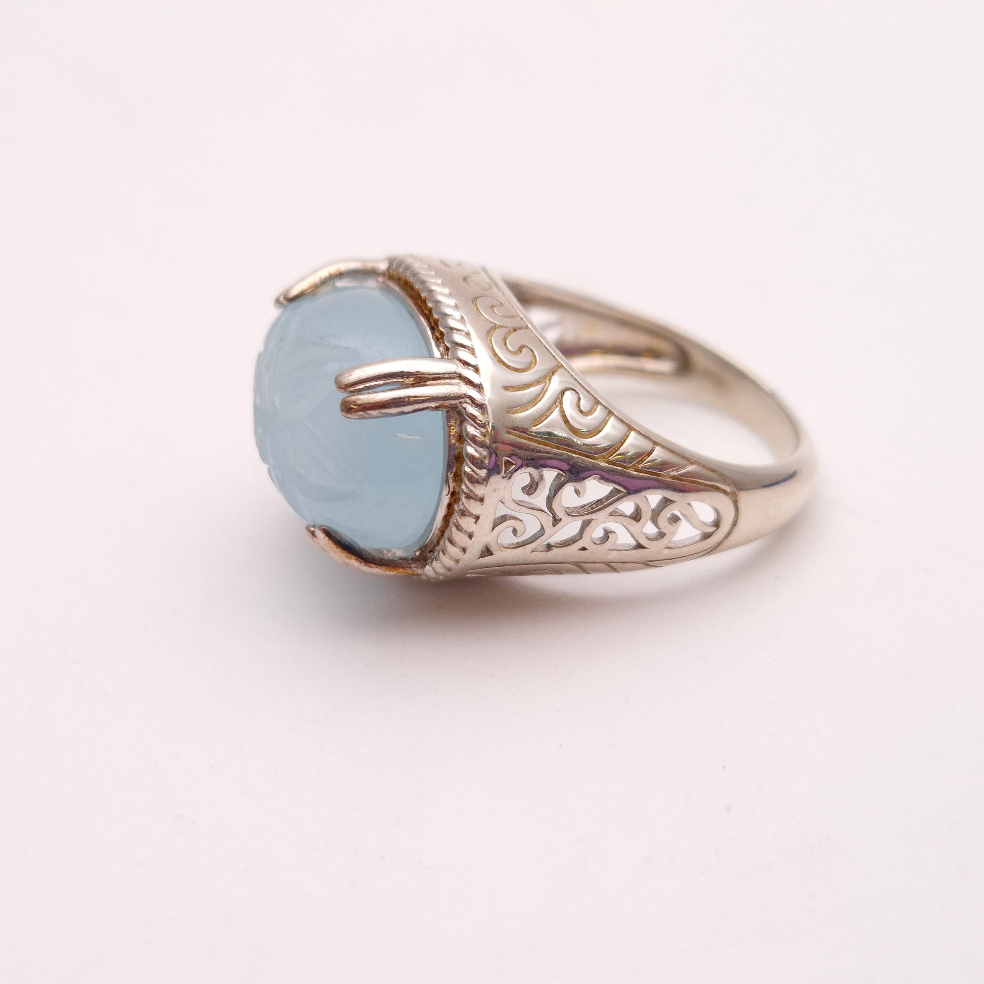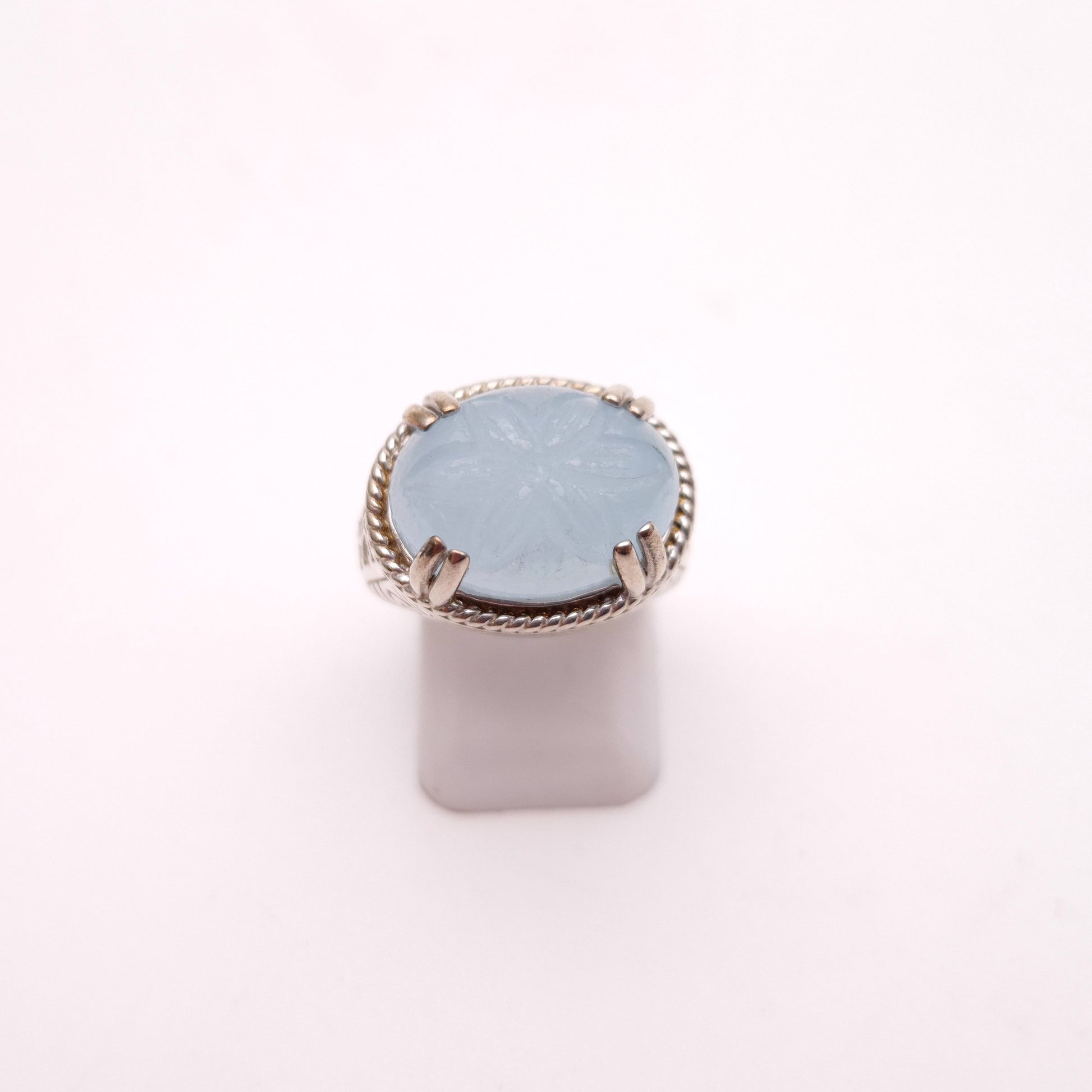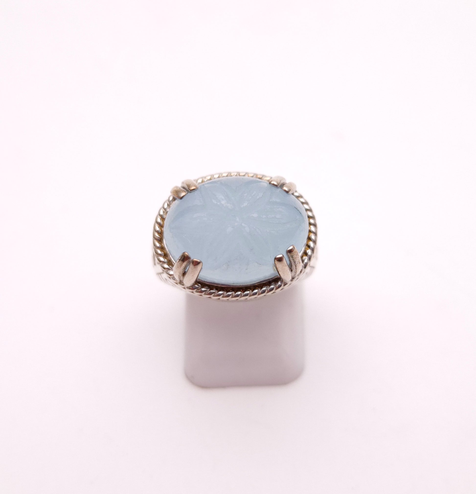 The focal point of this ring is a substantial oval jade cabochon. What sets this stone apart is the exquisite floral carving directly on its surface, which adds depth, texture, and a unique artistic dimension to the jade. This carving depicts a single bloom, showcasing skilled artistry. The jade is securely set in a high-profile, ornate sterling silver setting, designed to elevate the gemstone and enhance its presence on the hand. The silver work around the jade features a rope twist border and intricate filigree or scrollwork on the shoulders and base adding to the ring's luxurious and vintage-inspired appeal.