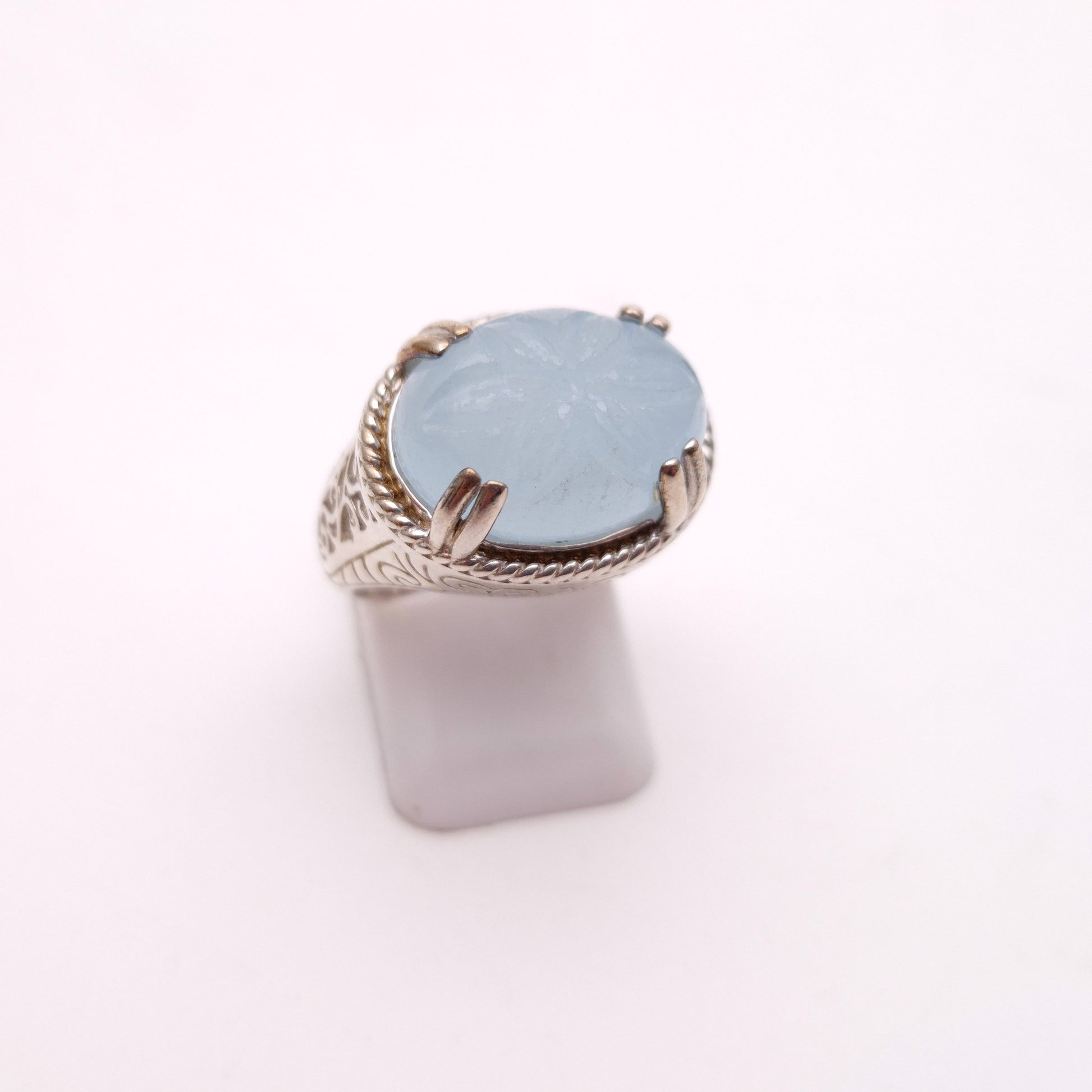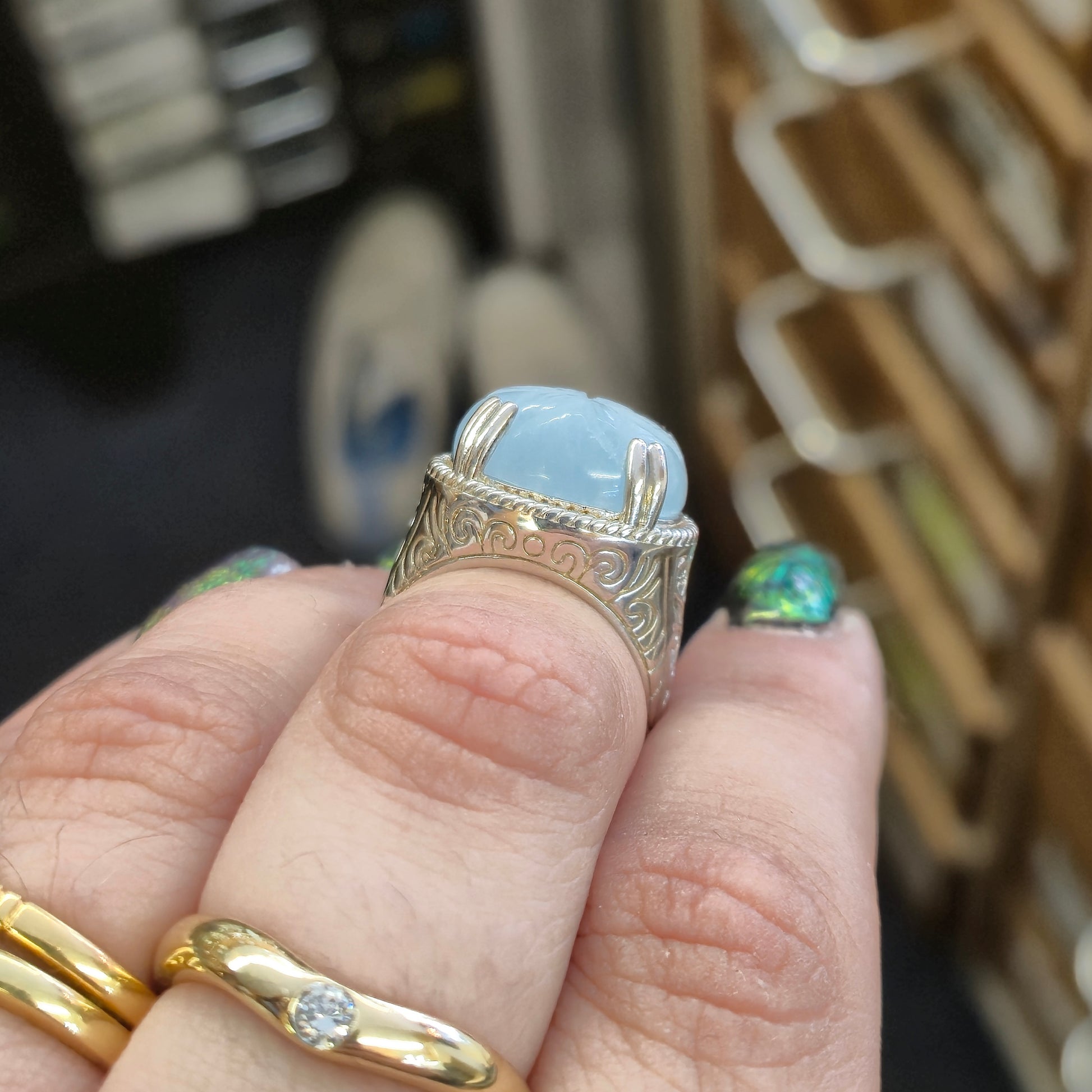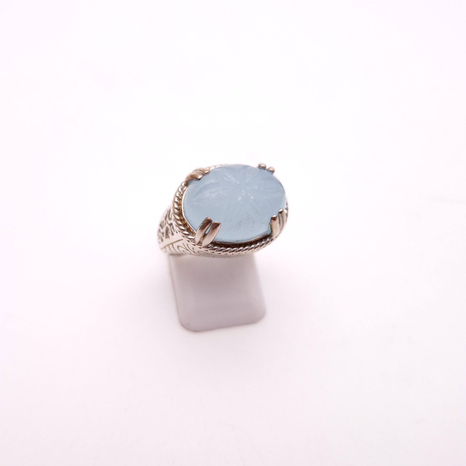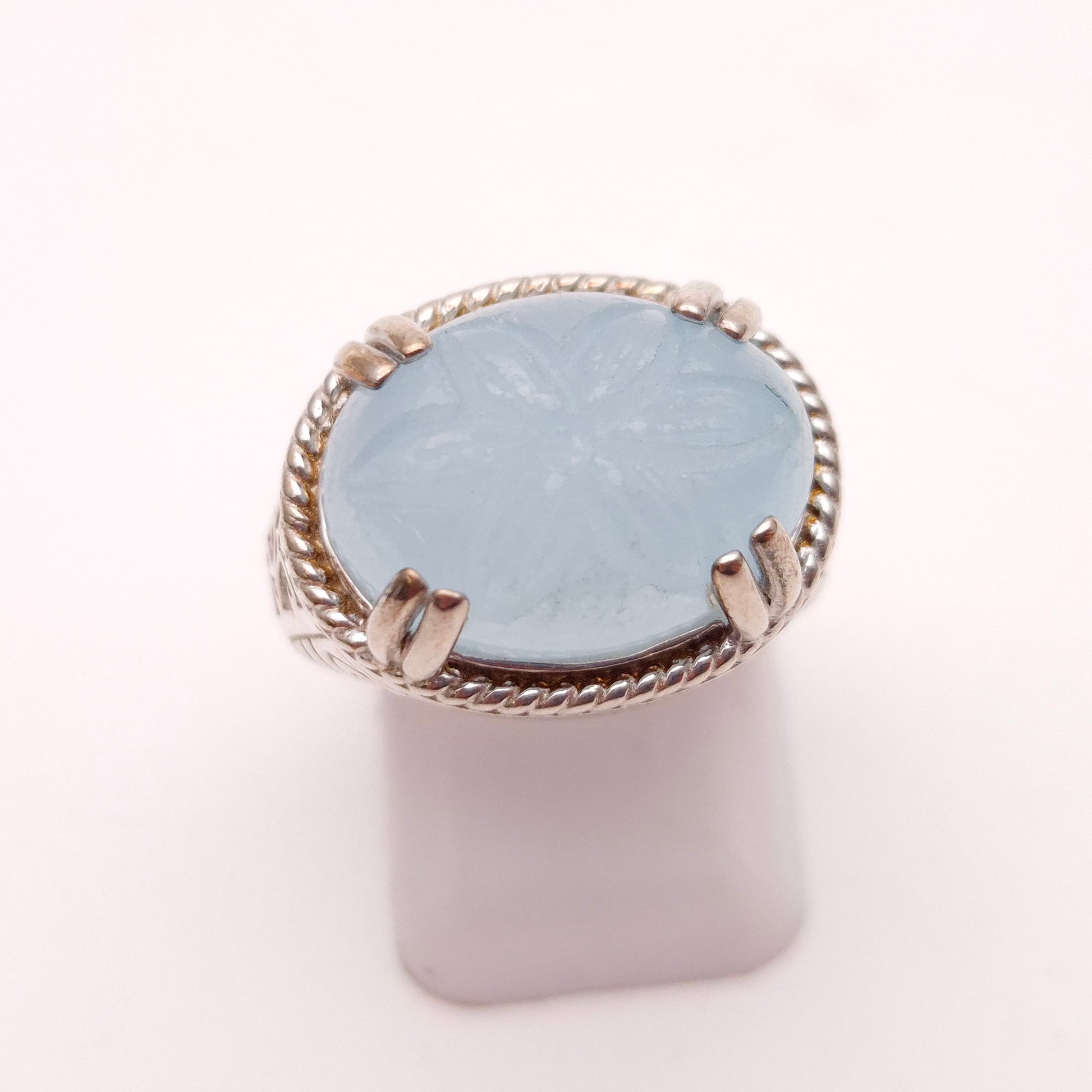 The focal point of this ring is a substantial oval jade cabochon. What sets this stone apart is the exquisite floral carving directly on its surface, which adds depth, texture, and a unique artistic dimension to the jade. This carving depicts a single bloom, showcasing skilled artistry. The jade is securely set in a high-profile, ornate sterling silver setting, designed to elevate the gemstone and enhance its presence on the hand. The silver work around the jade features a rope twist border and intricate filigree or scrollwork on the shoulders and base adding to the ring's luxurious and vintage-inspired appeal.