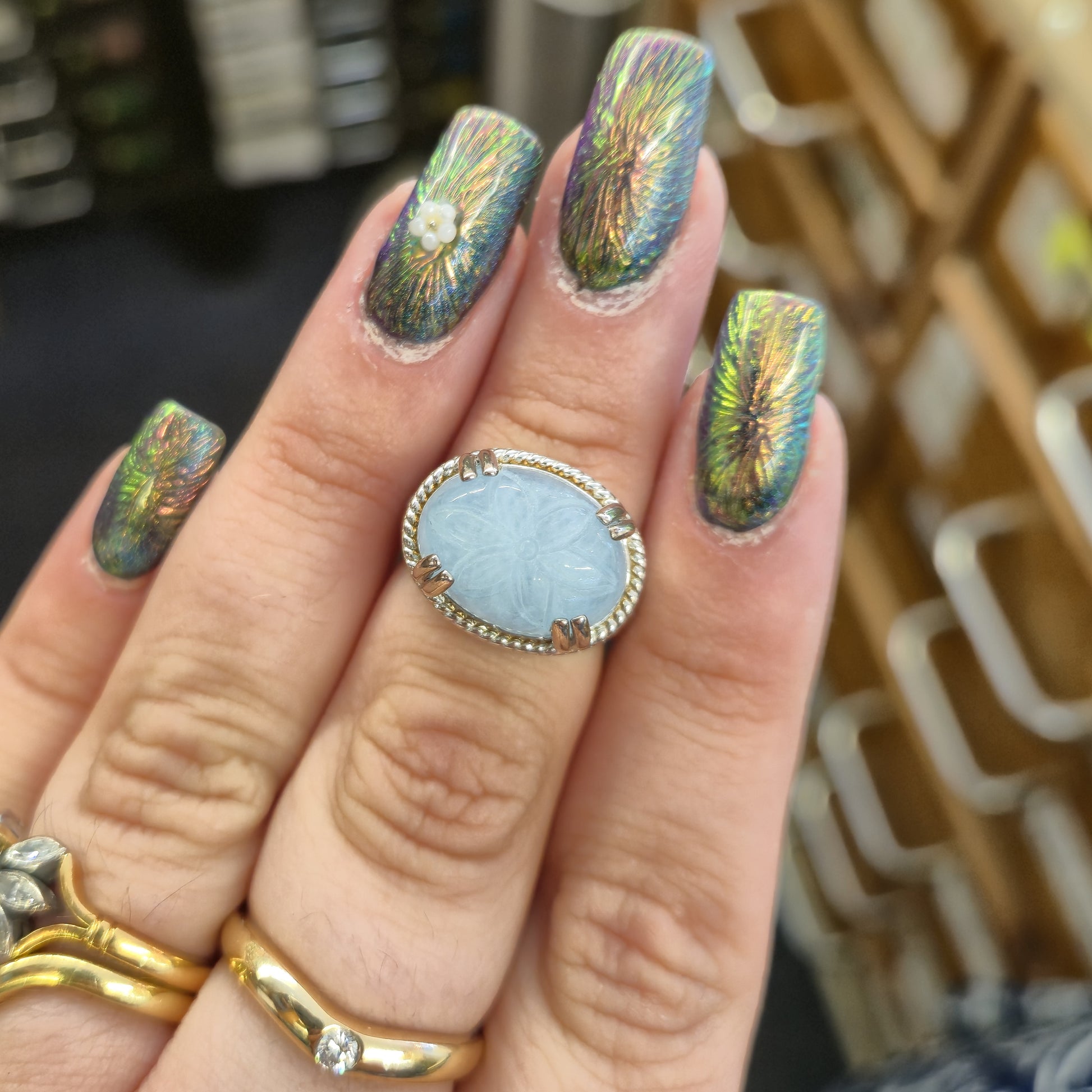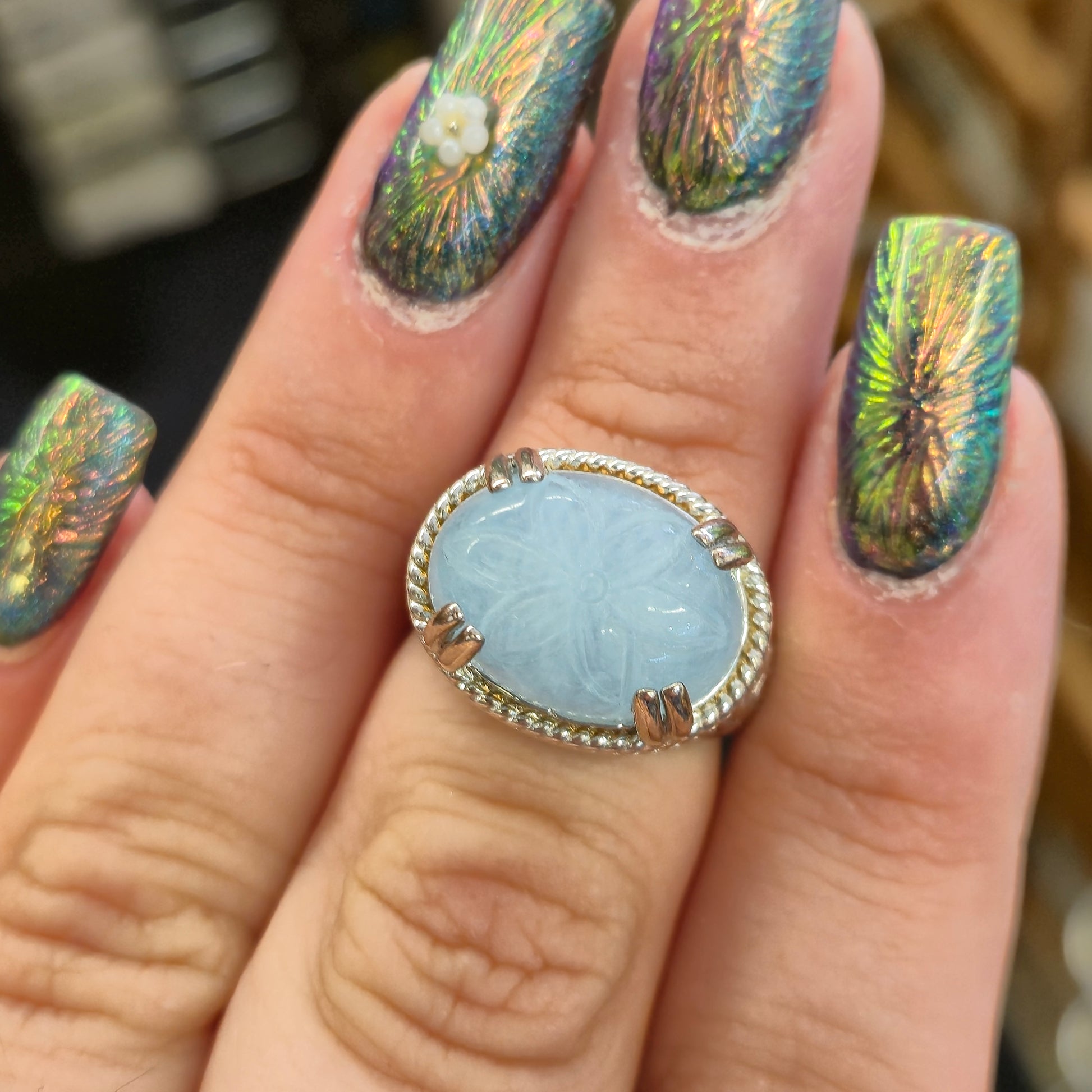 Make a truly distinctive statement with this impressive sterling silver ring, featuring a captivating floral carved jade cabochon. This ring is a fusion of natural beauty and artistic craftsmanship, designed to draw attention and admiration.