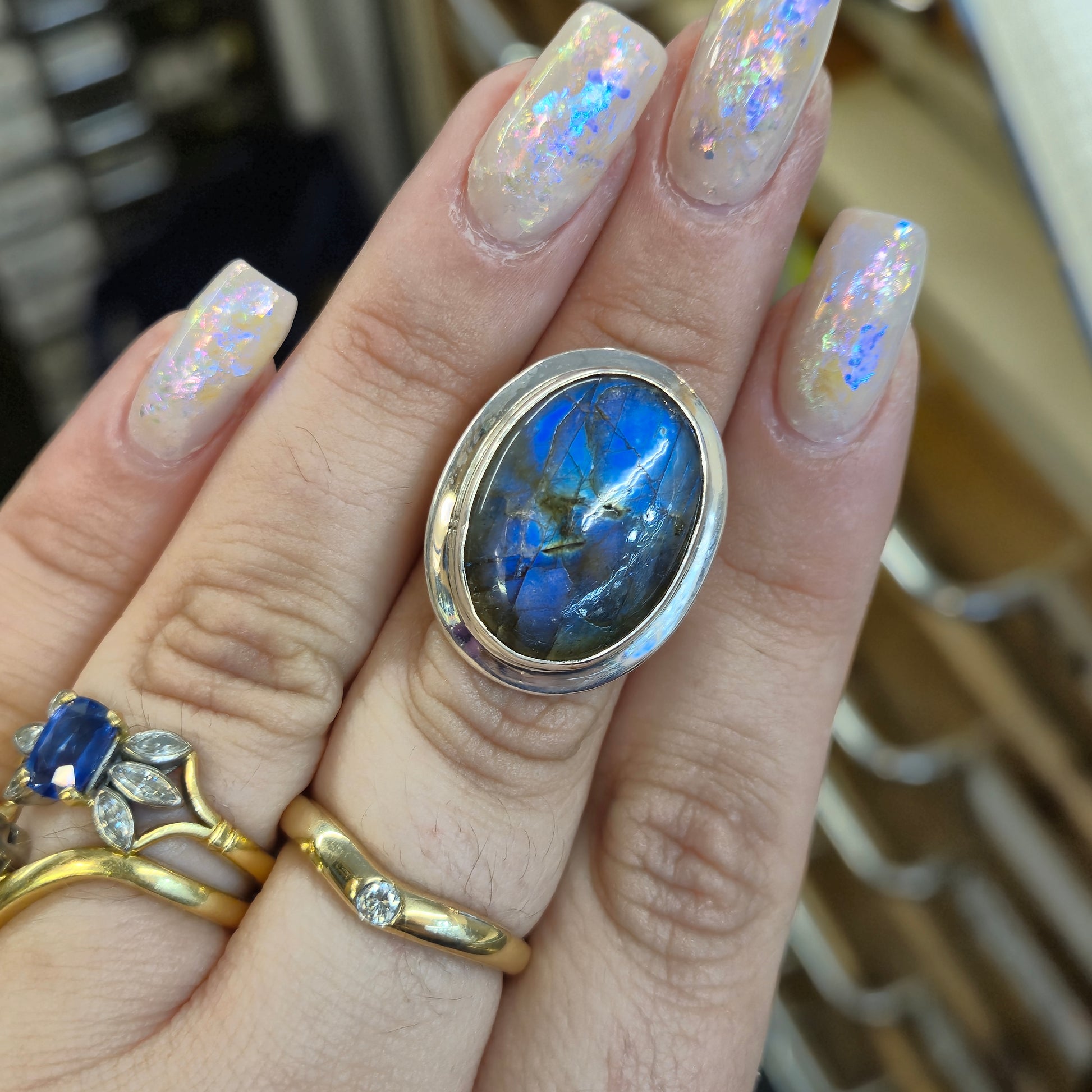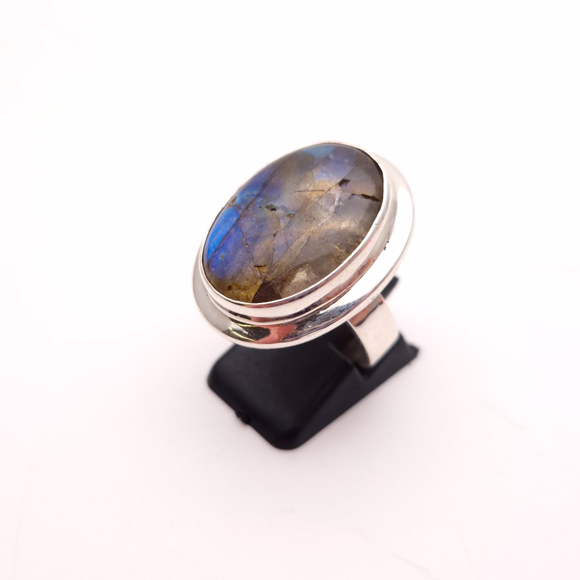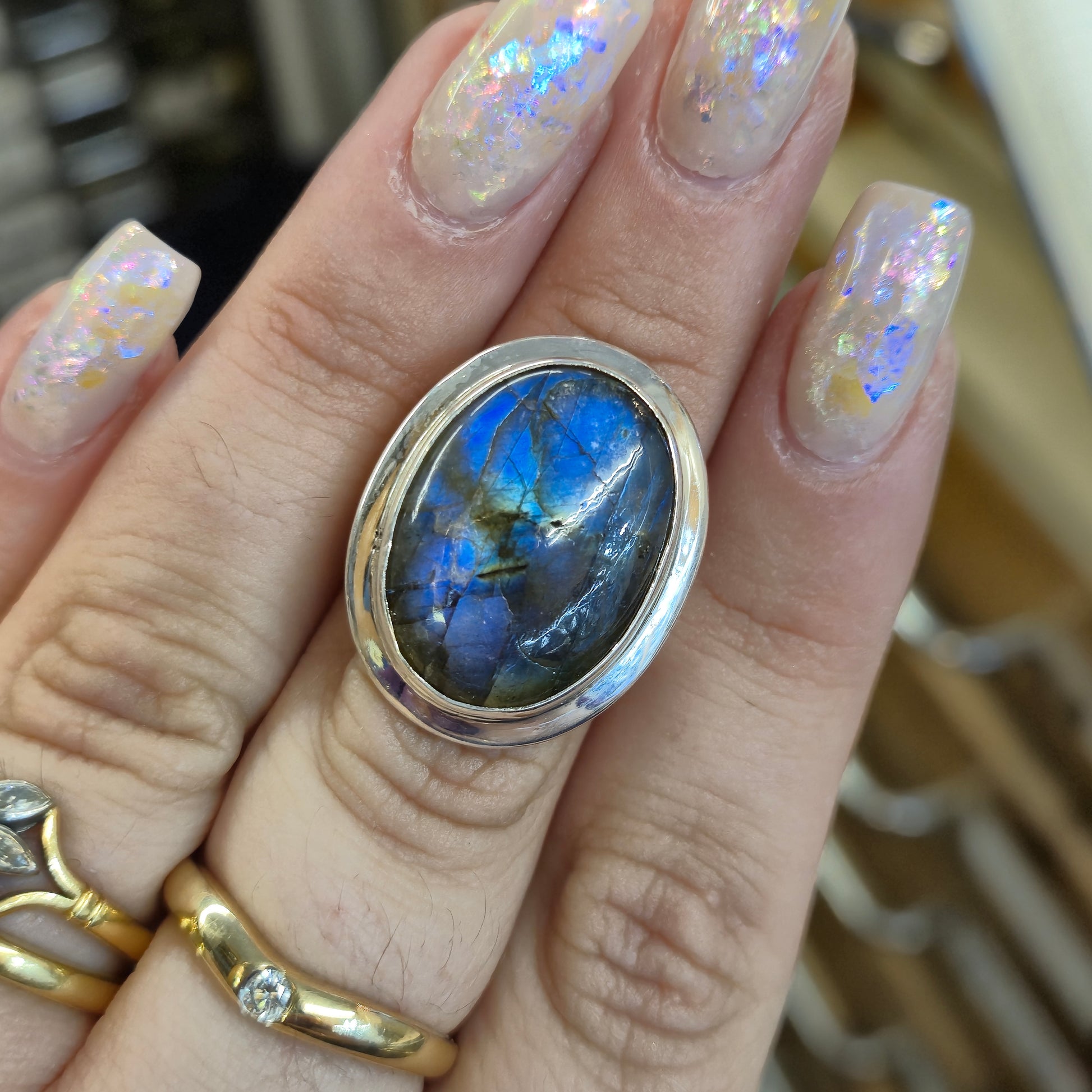 Unleash the mystical beauty of nature with this striking sterling silver statement ring. This piece features a large, captivating oval cabochon of genuine Labradorite, renowned for its incredible play of light, known as "labradorescence." As you move the ring, the stone flashes with brilliant hues of electric blue, golden yellow, and hints of green, as if holding a hidden galaxy within.