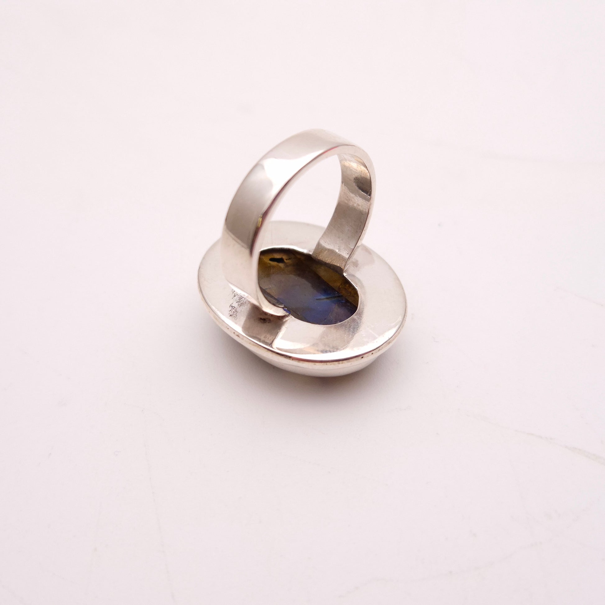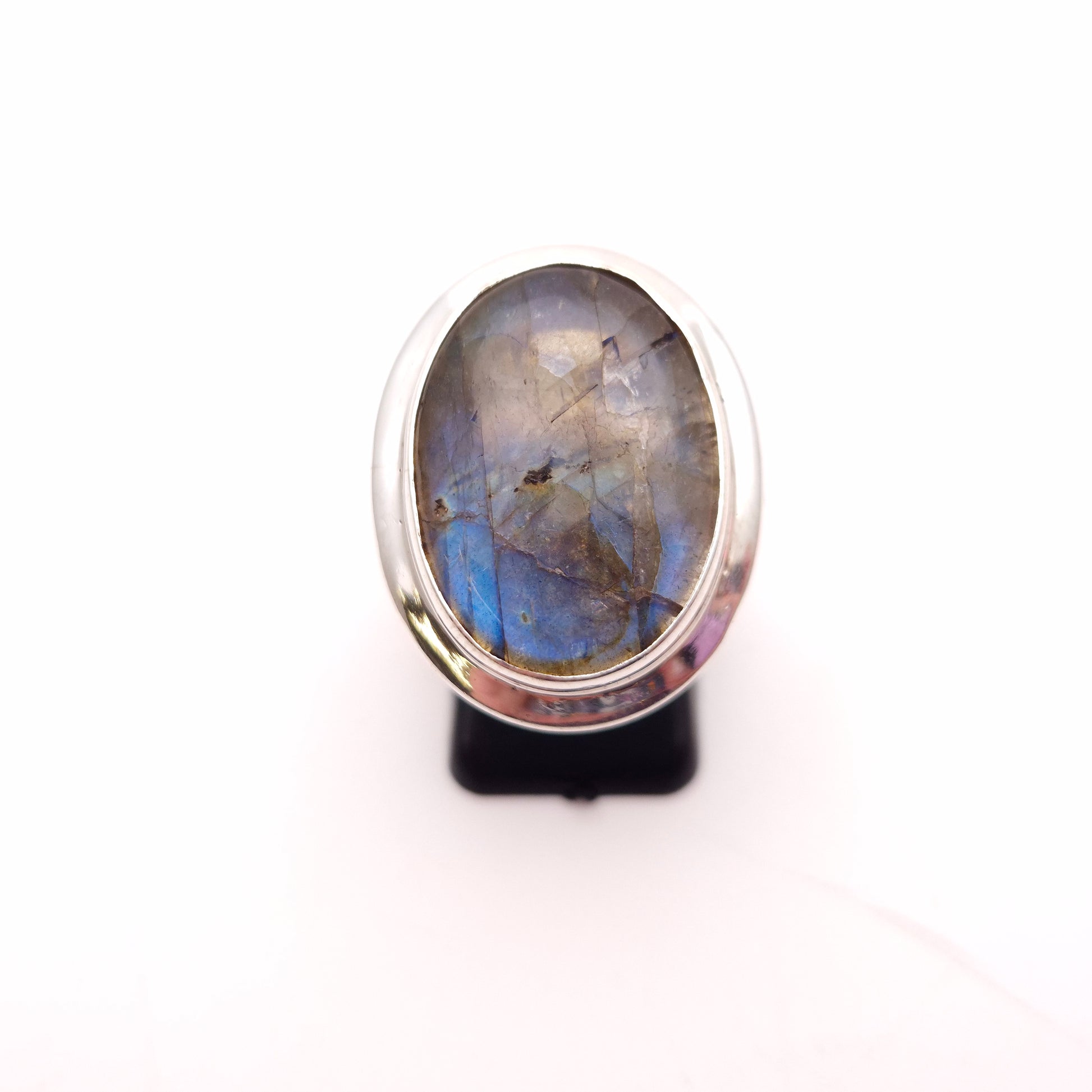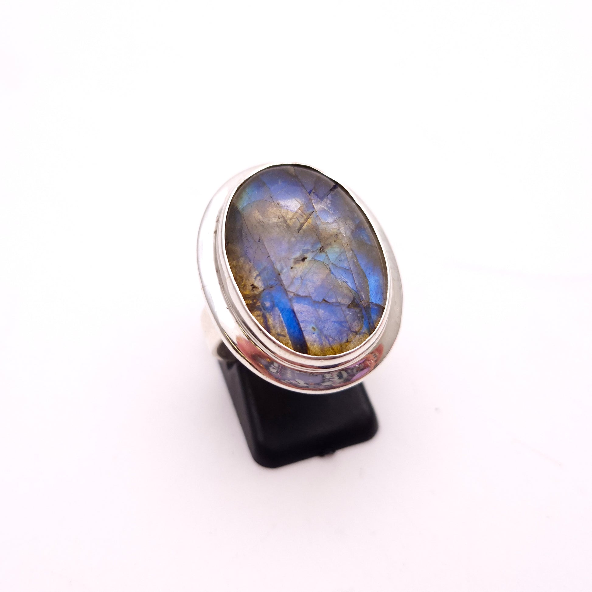 Unleash the mystical beauty of nature with this striking sterling silver statement ring. This piece features a large, captivating oval cabochon of genuine Labradorite, renowned for its incredible play of light, known as "labradorescence." As you move the ring, the stone flashes with brilliant hues of electric blue, golden yellow, and hints of green, as if holding a hidden galaxy within.