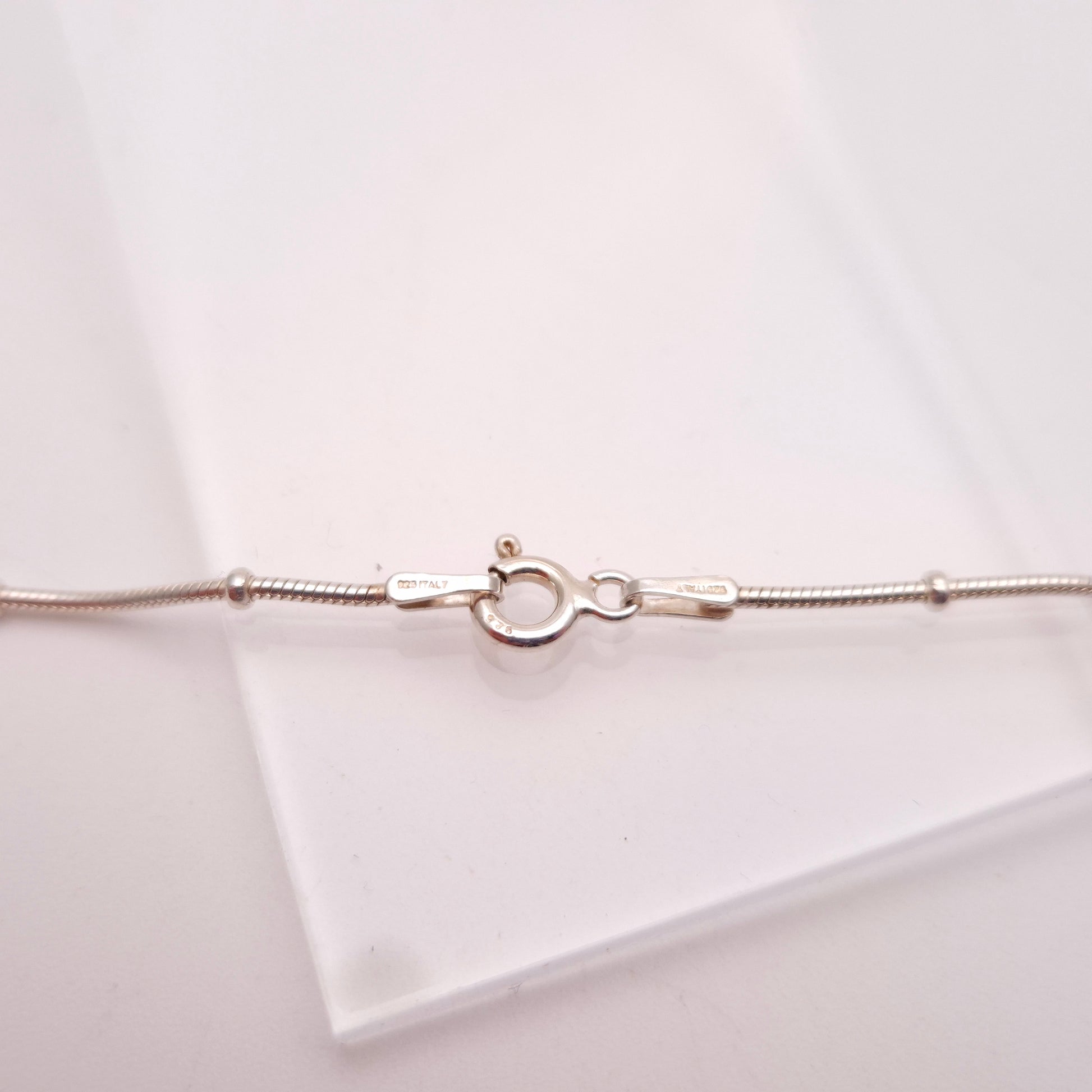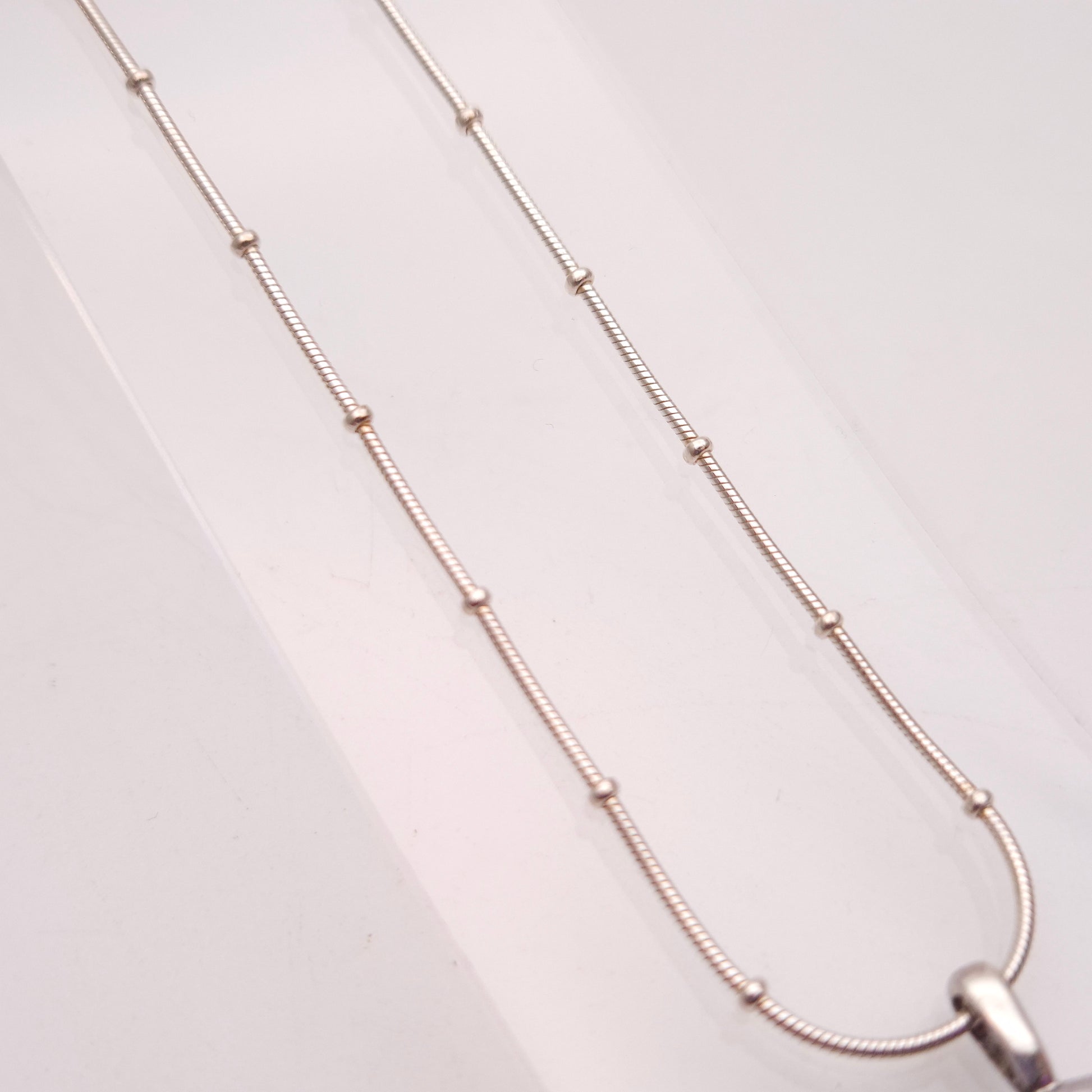 The smooth, fluid lines of the design evoke images of ocean waves or a serene landscape, making this a perfect accessory for those who love nature-inspired themes. The pendant hangs from a delicate beaded sterling silver chain, ensuring the focus remains on its unique and eye-catching design.