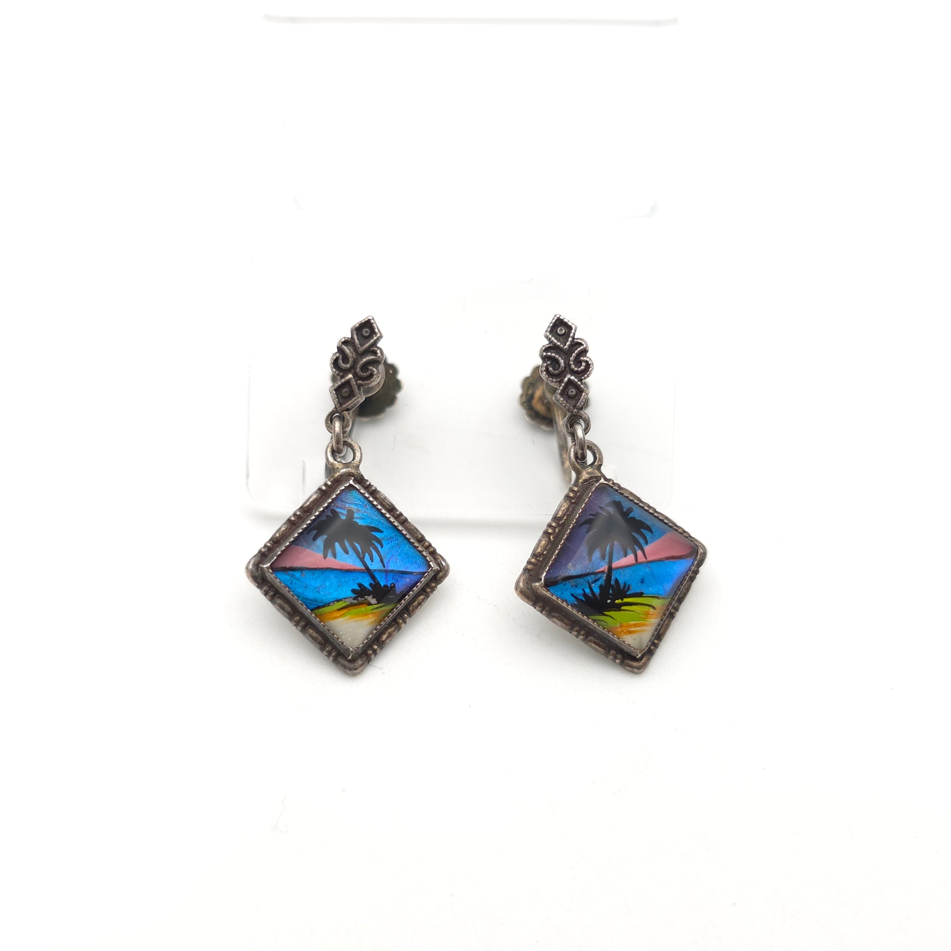 Sterling Silver Vintage Butterfly Wing Beach Scene Drop Earrings