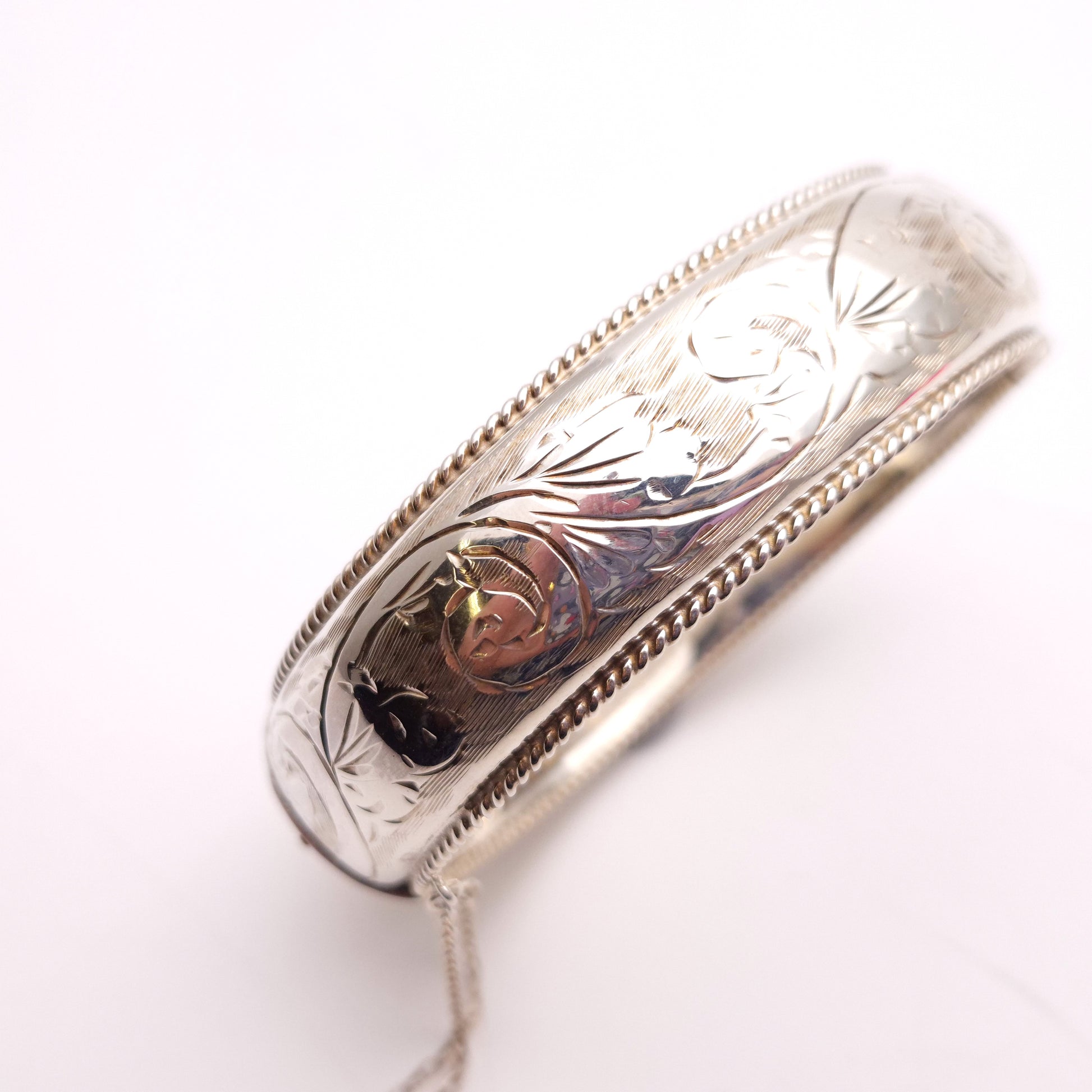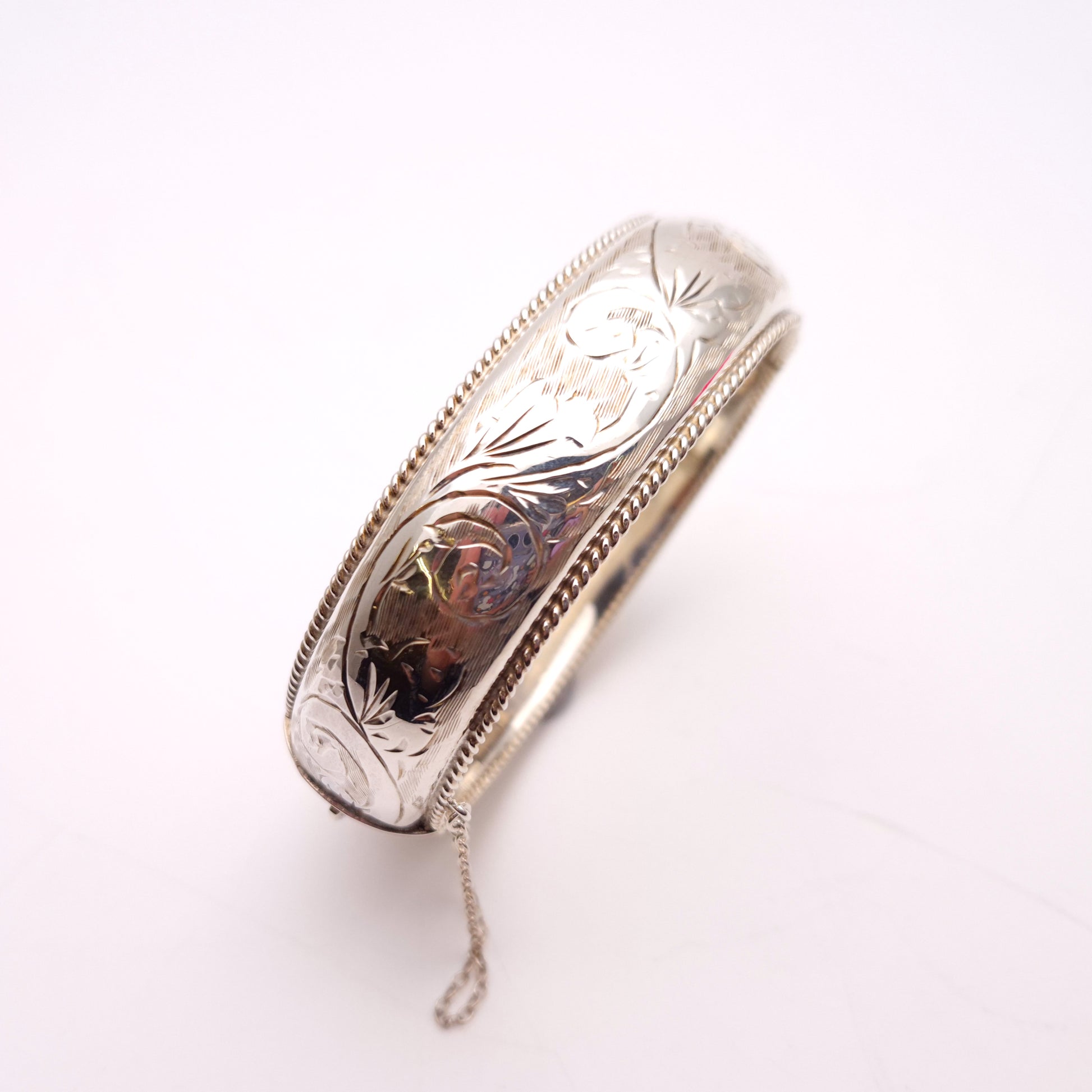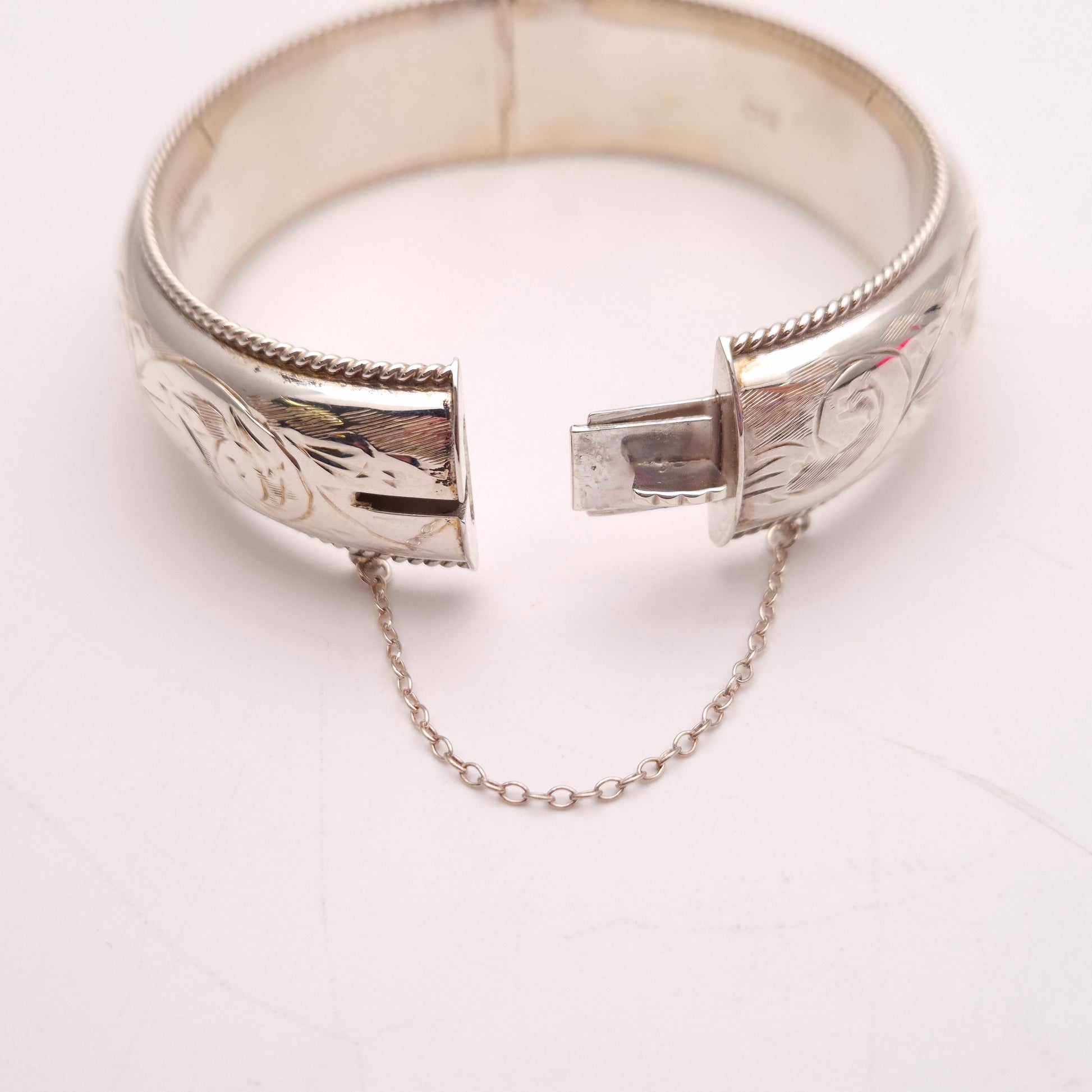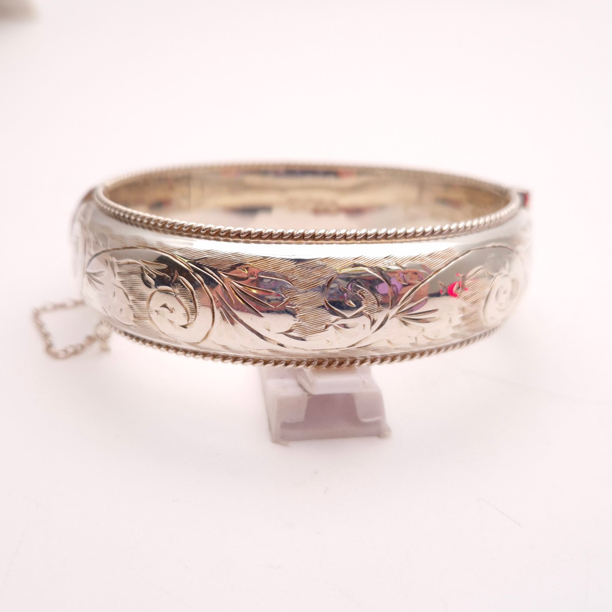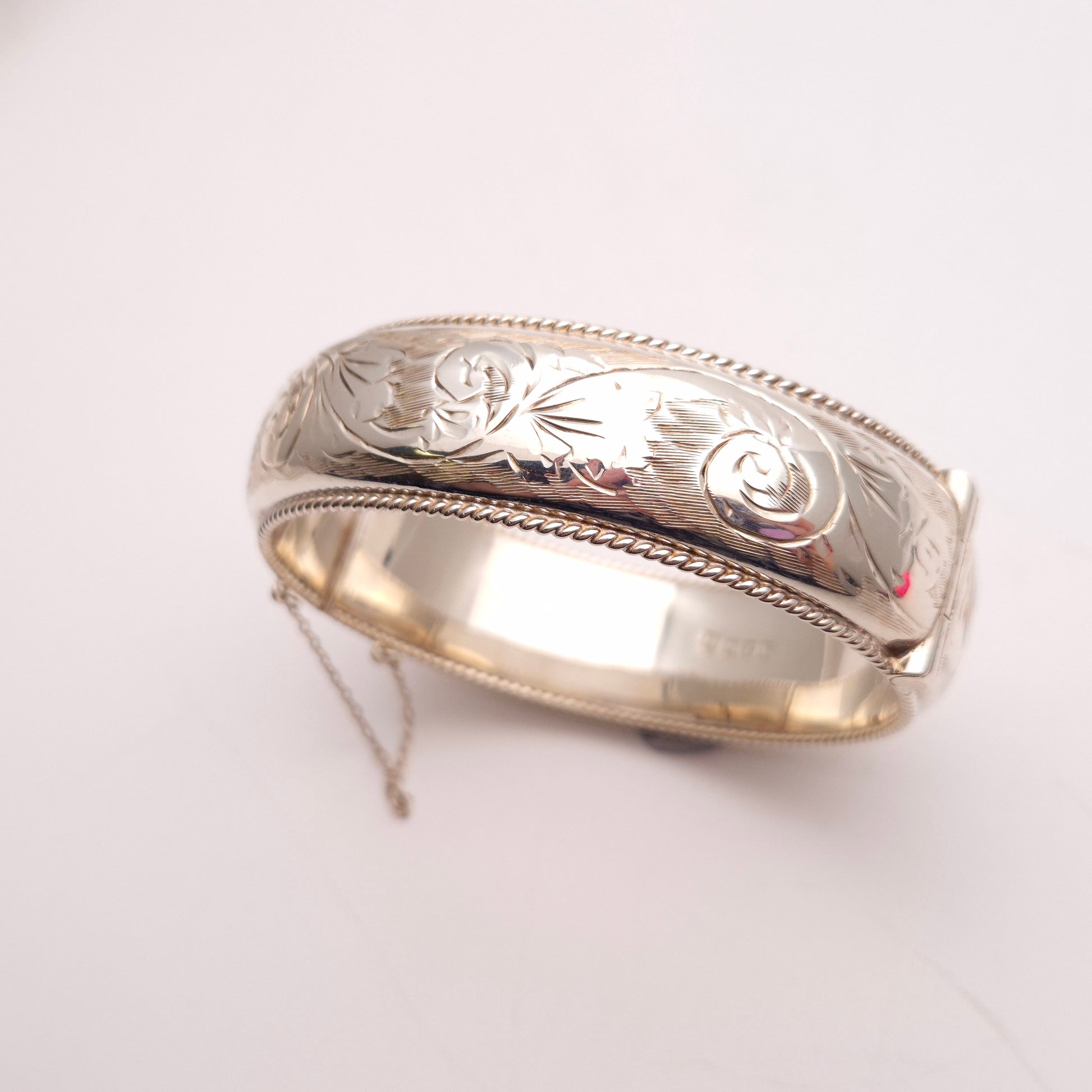 Crafted from lustrous sterling silver, hallmarked in Chester 1960, the entire surface of this bangle is meticulously hand-engraved with a rich and continuous pattern, likely featuring delicate floral scrolls, foliate motifs, or elegant geometric designs. This all-over engraving creates a stunning textural effect that catches and reflects light beautifully, giving the bangle a unique, shimmering allure. The details of the pattern evoke the artistry popular in the late Victorian, Edwardian, or early Art Deco periods, making it a genuine piece of history.