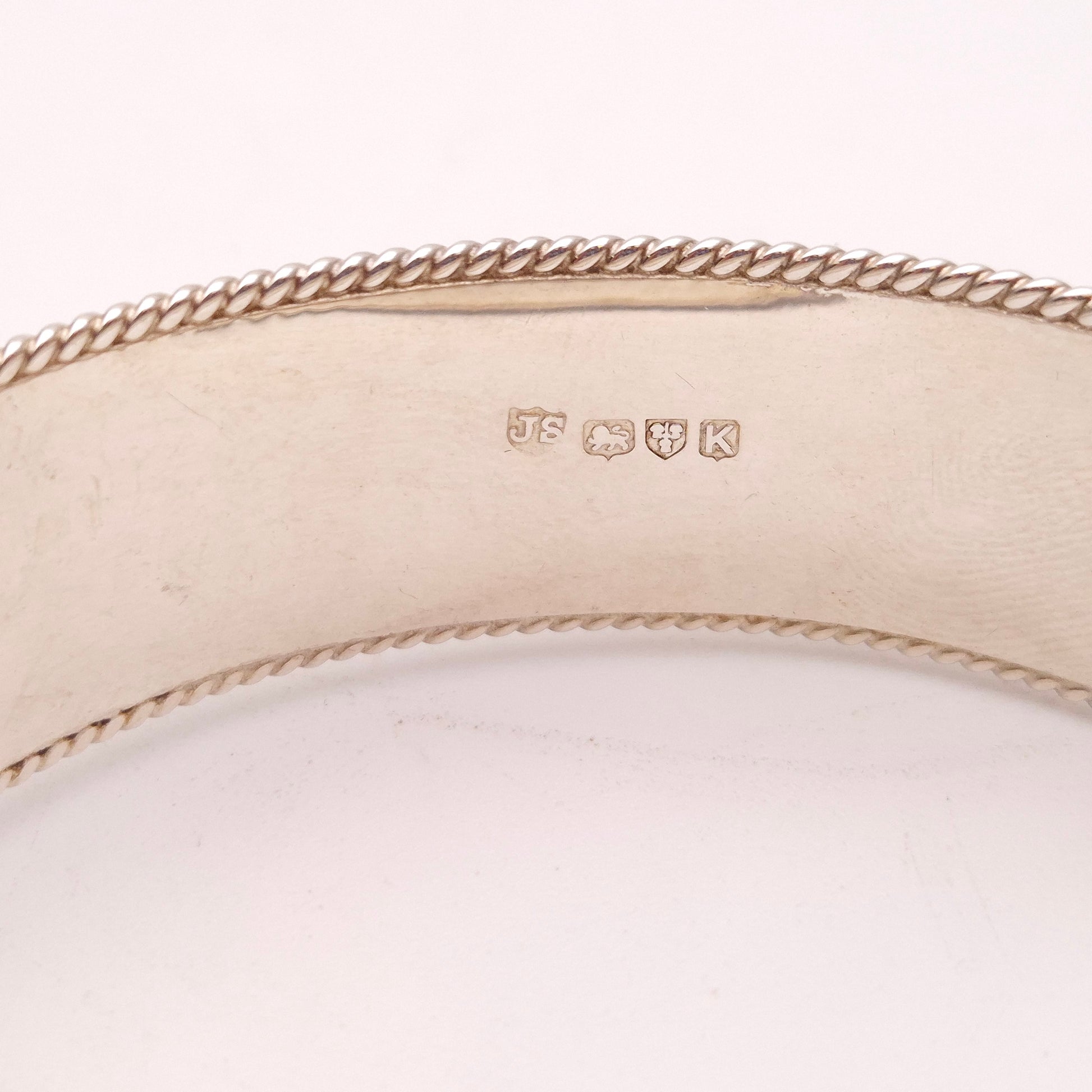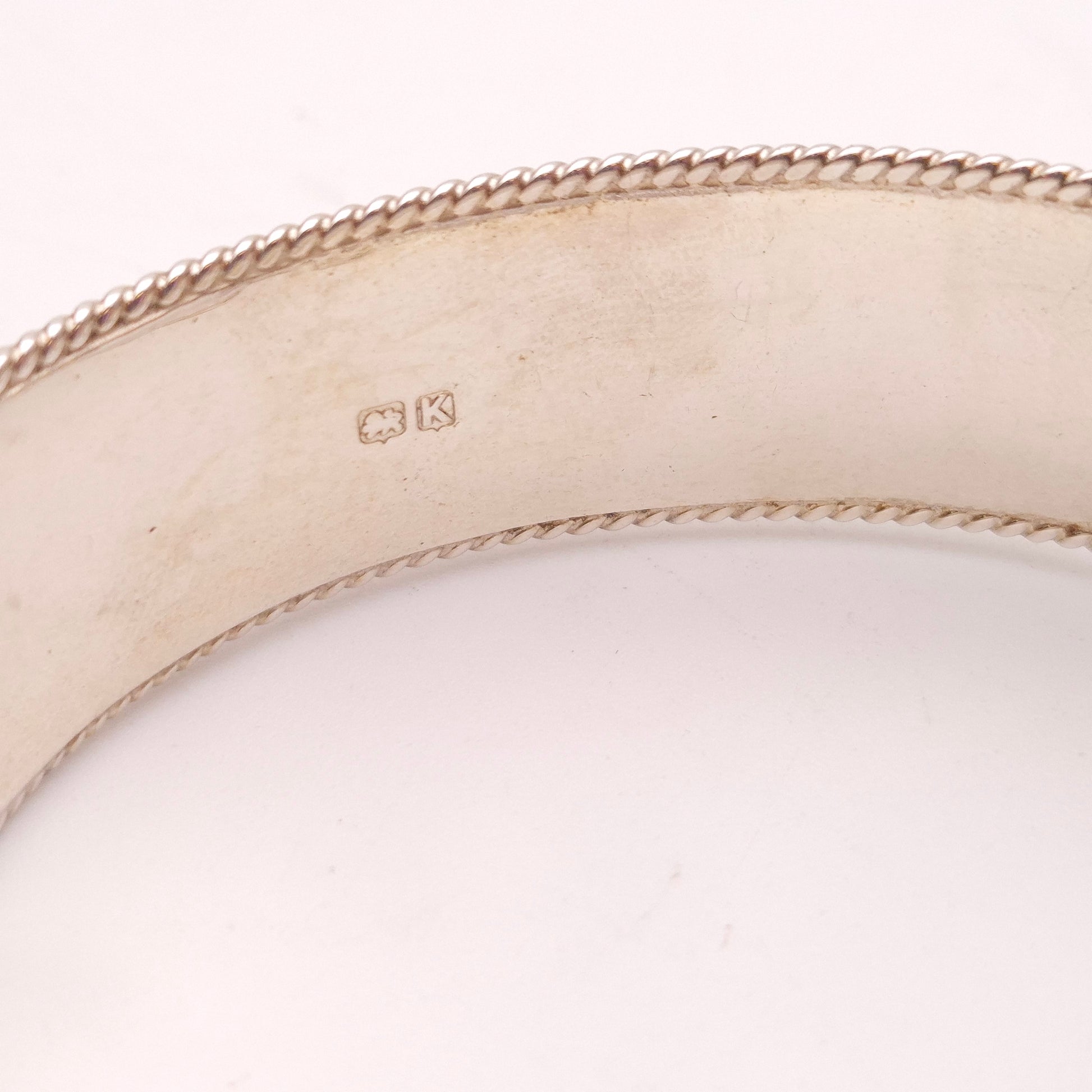 Designed for comfortable wear and ease of donning, the bangle features a robust hinged mechanism and a secure clasp. This ensures it sits perfectly on the wrist, offering both security and convenience. The substantial feel of the silver combined with the intricate detailing makes this bangle a luxurious and eye-catching accessory.