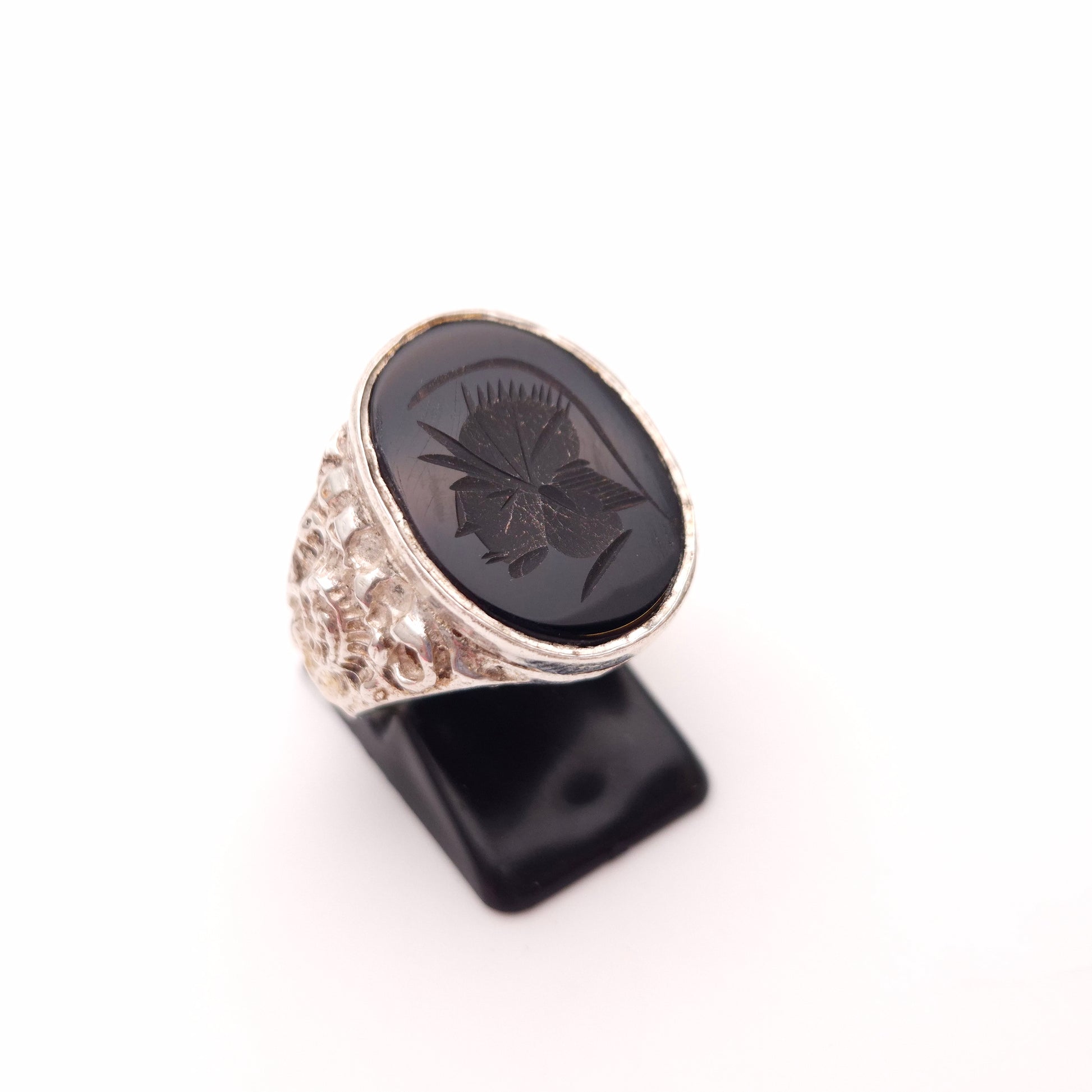 The silver band itself is broad and decorated with abstract carvings and texture on the shoulders, adding to the ring's overall statement presence and vintage appeal. This piece functions as a commanding Signet Ring and is an excellent choice for a strong accessory or a collector of historically inspired jewellery.