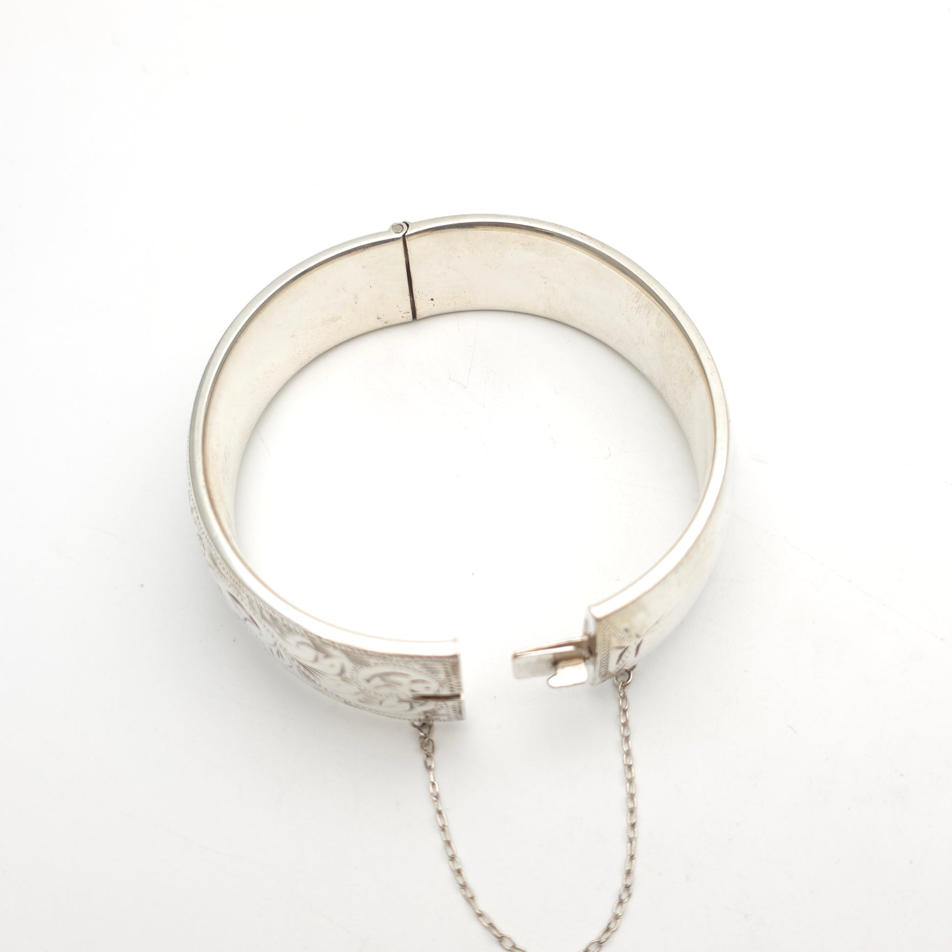 The bangle is equipped with a traditional integrated box clasp and a sturdy safety chain for added security. Whether worn alone as a striking vintage accessory or stacked with other silver bracelets for a maximalist look, this engraved bangle brings a touch of timeless romanticism and historical charm to any collection.