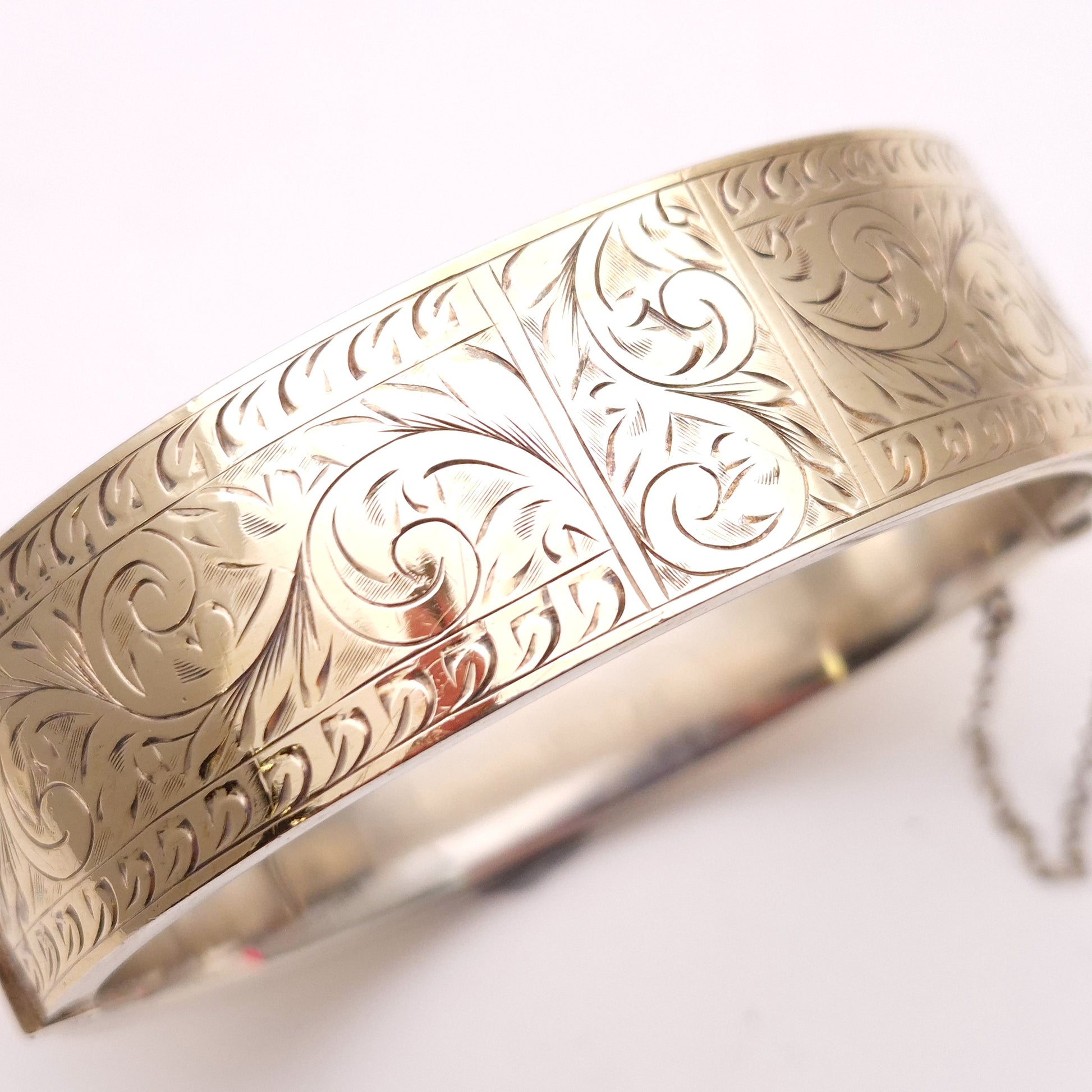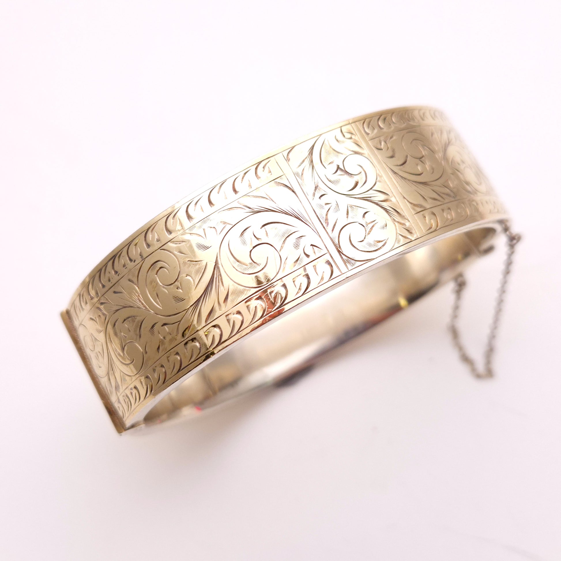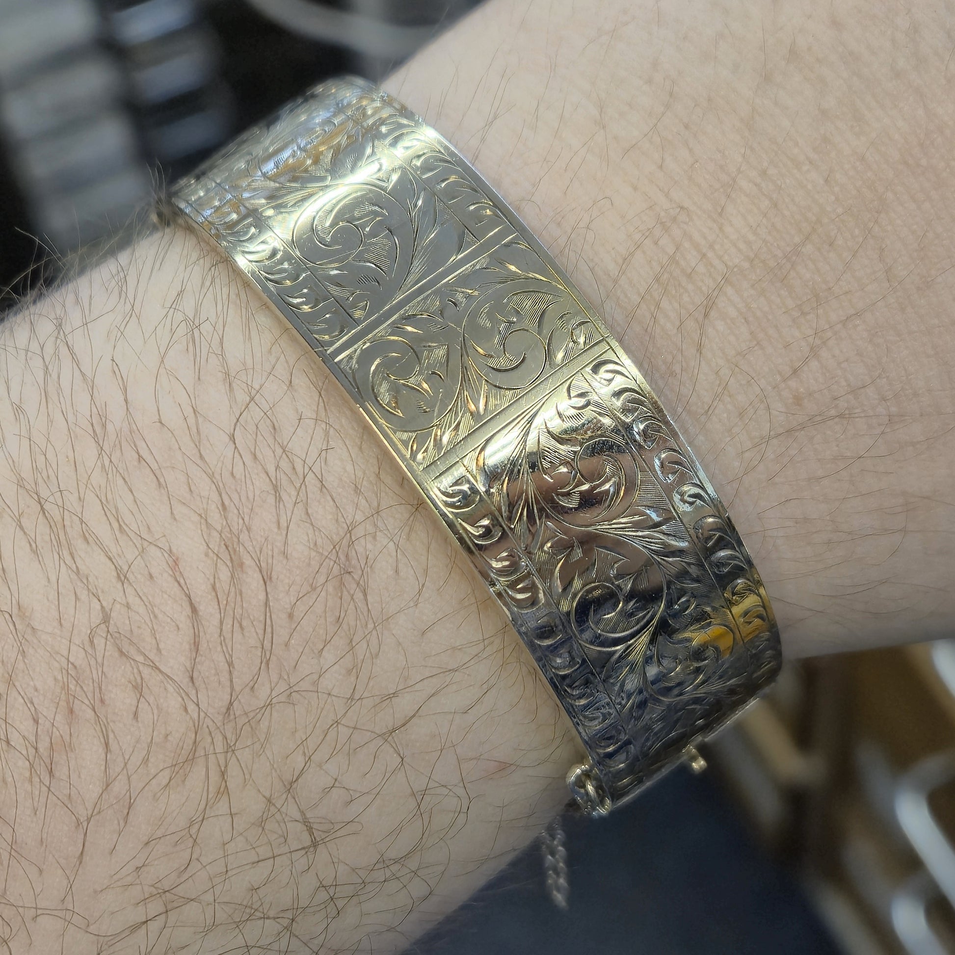 The bangle boasts a robust sterling silver body, providing both durability and a cool, elegant backdrop. The front half of the bangle is overlaid or crafted with genuine 9ct yellow gold, creating a striking contrast and adding a rich, warm glow. This gold front is meticulously hand-engraved with an intricate foliate pattern, likely featuring elegant leaves, vines, and scrolls that dance across the surface. This detailed engraving catches the light beautifully, highlighting the artistry and providing a wonderful texture.